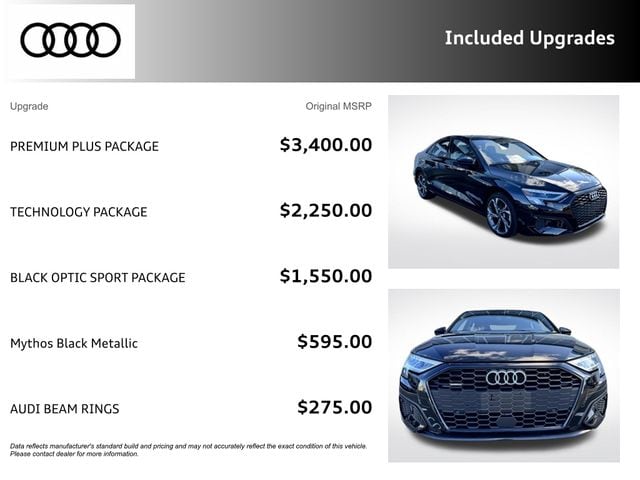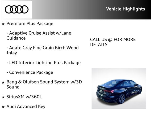 Certified. Mythos Black Metallic 2023 Audi A3 40 Premium Plus quattro quattro 7-Speed Automatic S tronic 2.0L 4-Cylinder TFSI RECENT HOFFMAN TRADE, CLEAN CAR FAX...NO ACCIDENTS, AUDI CERTIFIED, SERVICE RECORDS AVAILABLE, ONE OWNER, NAVIGATION GPS NAV, SUNROOF MOONROOF, REMAINDER OF FACTORY WARRANTY, 6 MONTH OR 6,000 POWERTRAIN WARRANTY, Adaptive Cruise Assist w/Lane Guidance, Agate Gray Fine Grain Birch Wood Inlay, Alarm System w/Motion Sensor, Audi Advanced Key, Audi Connect PLUS, Audi MMI Navigation Plus, Audi Side Assist, Audi Virtual Cockpit Plus, Auto-Dimming Interior Mirror w/Compass, Auto-Dimming Power Folding Exterior Mirrors, Bang & Olufsen Sound System w/3D Sound, Black Exterior Trim, Black Optic Sport Package, Convenience Package, Heated front seats, LED Interior Lighting Plus Package, Memory for Driver's Seat, Navigation System, Park Assist, Power moonroof, Premium Plus Package, SiriusXM w/360L, Sport Suspension (-15 mm), Technology Package, Traffic Sign Recognition, Wheels: 18" 5-Y-Spoke Design, Wireless Phone Charging Pad.