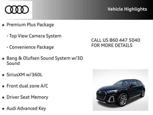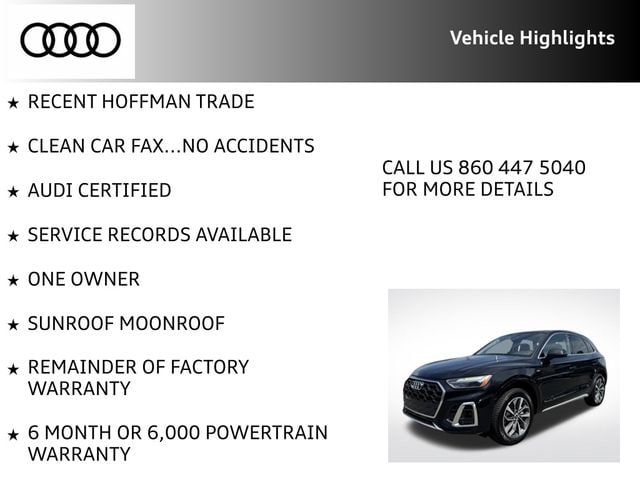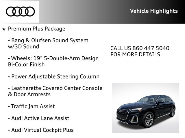 Certified. Mythos Black Metallic 2023 Audi Q5 45 S line Premium Plus quattro quattro 7-Speed Automatic S tronic 2.0L Turbocharged RECENT HOFFMAN TRADE, CLEAN CAR FAX...NO ACCIDENTS, AUDI CERTIFIED, SERVICE RECORDS AVAILABLE, ONE OWNER, SUNROOF MOONROOF, REMAINDER OF FACTORY WARRANTY, 6 MONTH OR 6,000 POWERTRAIN WARRANTY, ABS brakes, Alloy wheels, Audi Active Lane Assist, Audi Advanced Key, Audi Virtual Cockpit Plus, Auto-Dimming Power Folding Exterior Mirrors, Bang & Olufsen Sound System w/3D Sound, Compass, Convenience Package, Driver Seat Memory, Electronic Stability Control, Front dual zone A/C, Hands-On Detection Steering Wheel, Heated door mirrors, Heated front seats, Heated Steering Wheel, Illuminated entry, Leatherette Covered Center Console & Door Armrests, Low tire pressure warning, Panoramic Sunroof, Power Adjustable Steering Column, Power Liftgate, Premium Plus Package, Remote keyless entry, SiriusXM w/360L, Top View Camera System, Traction control, Traffic Jam Assist, Wheels: 19" 5-Double-Arm Design Bi-Color Finish.