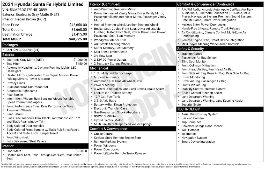 Beneath the sculpted body lies a potent I4 engine paired with a 6-Speed Automatic transmission and all-wheel drive, delivering an exceptional balance of power and efficiency. With an EPA-estimated 35 MPG in the city and 34 MPG on the highway, this Santa Fe Hybrid will help you conquer your daily commute with ease while reducing your environmental impact.