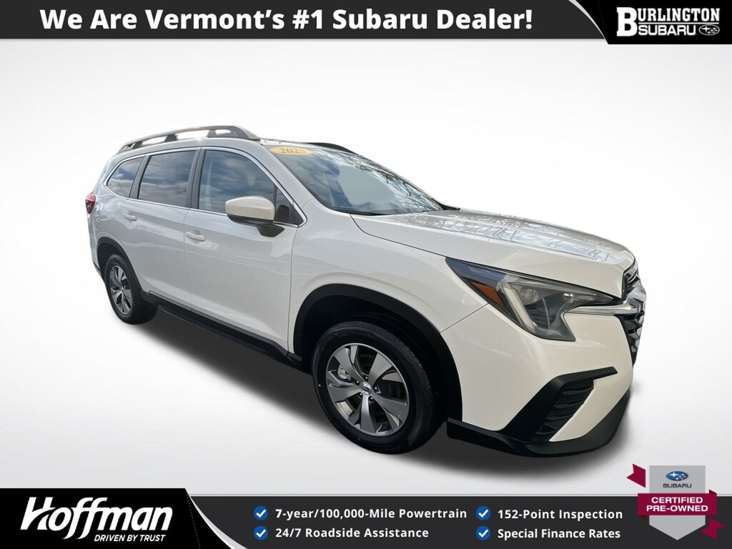Clean CARFAX. Subaru Ascent Premium 2025 Certified. 4-Wheel Disc Brakes, ABS brakes, Air Conditioning, Alloy wheels, AM/FM radio: SiriusXM with 360L, Apple CarPlay & Android Auto, Auto High-beam Headlights, Auto-dimming Rear-View mirror, Automatic temperature control, Brake assist, Compass, Delay-off headlights, Driver vanity mirror, Dual front impact airbags, Dual front side impact airbags, Electronic Stability Control, Emergency communication system: MySubaru Safety (3-year free trial), Exterior Parking Camera Rear, Four wheel independent suspension, Front dual zone A/C, Front reading lights, Fully automatic headlights, Garage door transmitter: HomeLink, Heated door mirrors, Heated Front Bucket Seats, Illuminated entry, Knee airbag, Leather Shift Knob, Leather steering wheel, Low tire pressure warning, Occupant sensing airbag, Outside temperature display, Overhead airbag, Overhead console, Panic alarm, Passenger vanity mirror, Power door mirrors, Power driver seat, Power Liftgate, Power steering, Power windows, Rear air conditioning, Rear reading lights, Rear window defroster, Rear window wiper, Reclining 3rd row seat, Remote keyless entry, Speed control, Speed-sensing steering, Spill Resistant Coated Cloth Upholstery, Split folding rear seat, Steering wheel mounted audio controls, Tachometer, Telescoping steering wheel, Tilt steering wheel, Traction control, Trip computer, Turn signal indicator mirrors, Variably intermittent wipers. Odometer is 2158 miles below market average!
