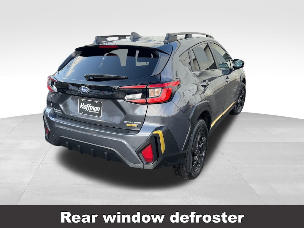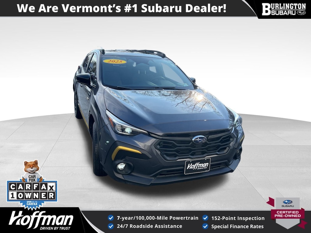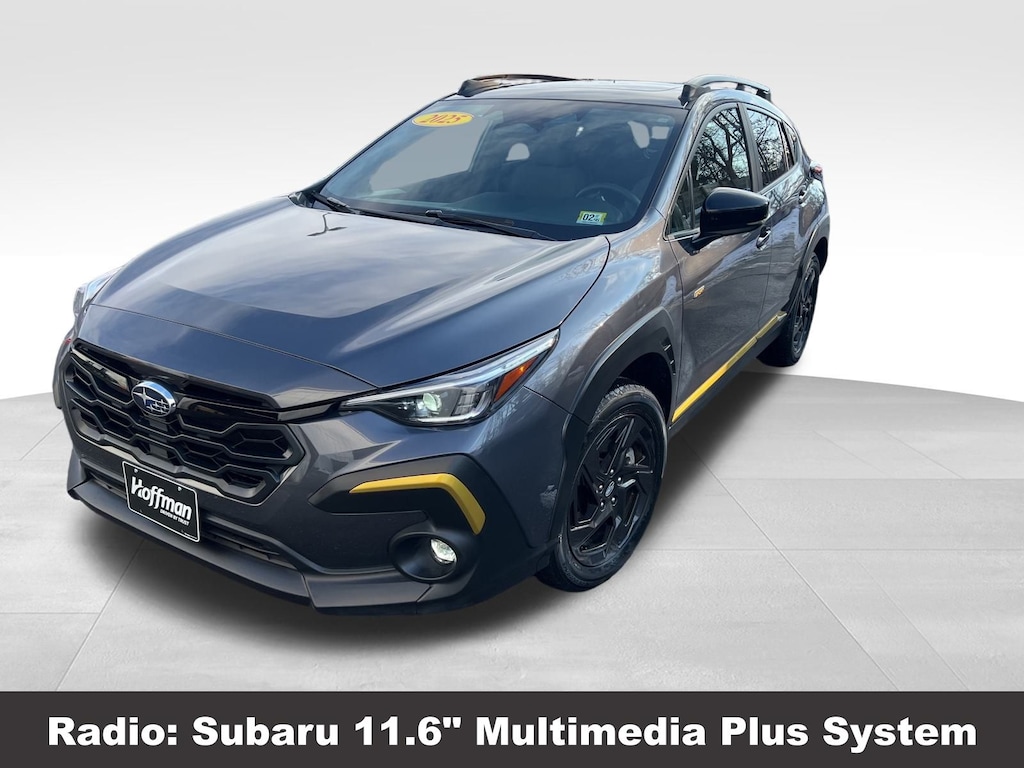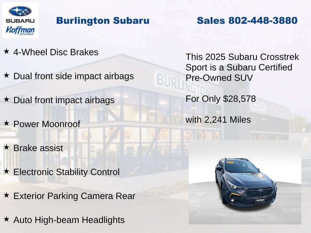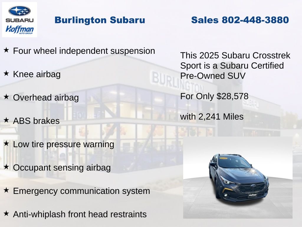 CARFAX One-Owner. Clean CARFAX. Subaru Crosstrek Sport 2025 Certified. 10-Way Power Driver's Seat, 4-Wheel Disc Brakes, ABS brakes, Air Conditioning, Alloy wheels, Anti-whiplash front head restraints, Auto High-beam Headlights, Automatic temperature control, Blind Spot Detection (BSD), Brake assist, BSD/RCTA & Power Driver Seat & Power Moonroof, Driver vanity mirror, Dual front impact airbags, Dual front side impact airbags, Electronic Stability Control, Emergency communication system, Exterior Parking Camera Rear, Four wheel independent suspension, Front dual zone A/C, Front fog lights, Front reading lights, Fully automatic headlights, Heated door mirrors, Heated Front Bucket Seats, Illuminated entry, Knee airbag, Leather Shift Knob, Leather steering wheel, Low tire pressure warning, Occupant sensing airbag, Outside temperature display, Overhead airbag, Overhead console, Panic alarm, Passenger vanity mirror, Power door mirrors, Power Moonroof, Power steering, Power windows, Radio: Subaru 11.6" Multimedia Plus System, Rear Cross-Traffic Alert (RCTA) System, Rear window defroster, Rear window wiper, Remote keyless entry, Speed control, Speed-sensing steering, Split folding rear seat, Steering wheel mounted audio controls, Tachometer, Telescoping steering wheel, Tilt steering wheel, Traction control, Trip computer, Turn signal indicator mirrors, Variably intermittent wipers. Odometer is 2060 miles below market average!