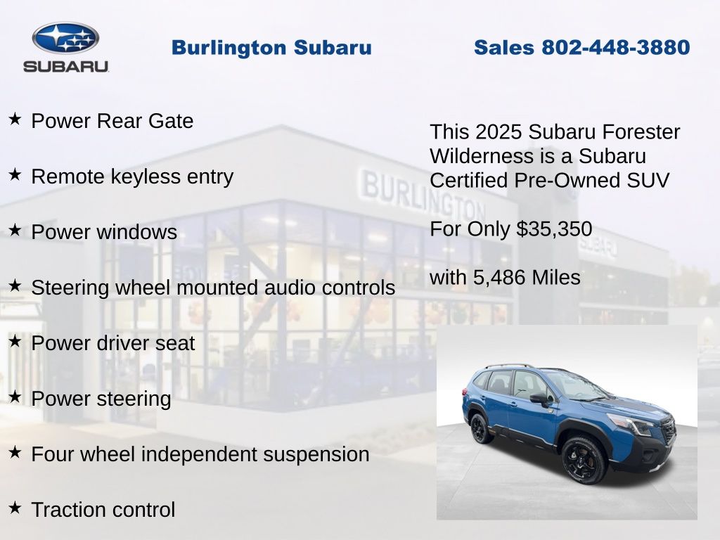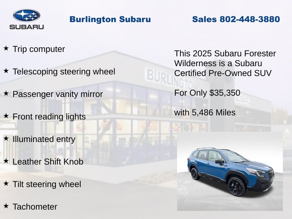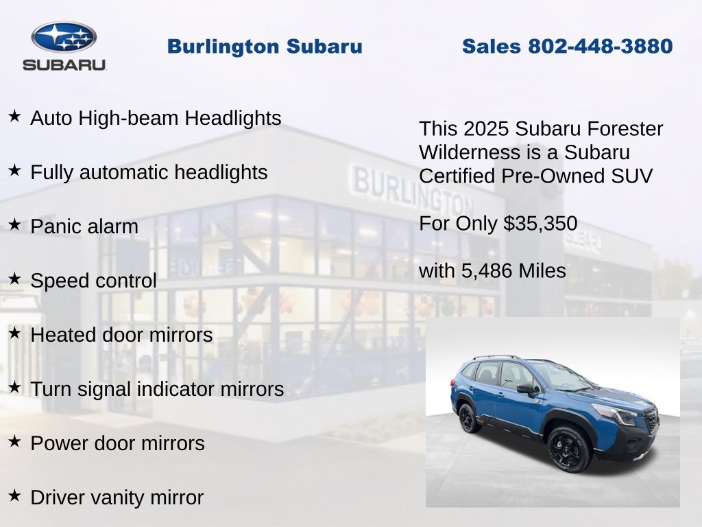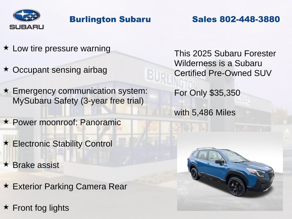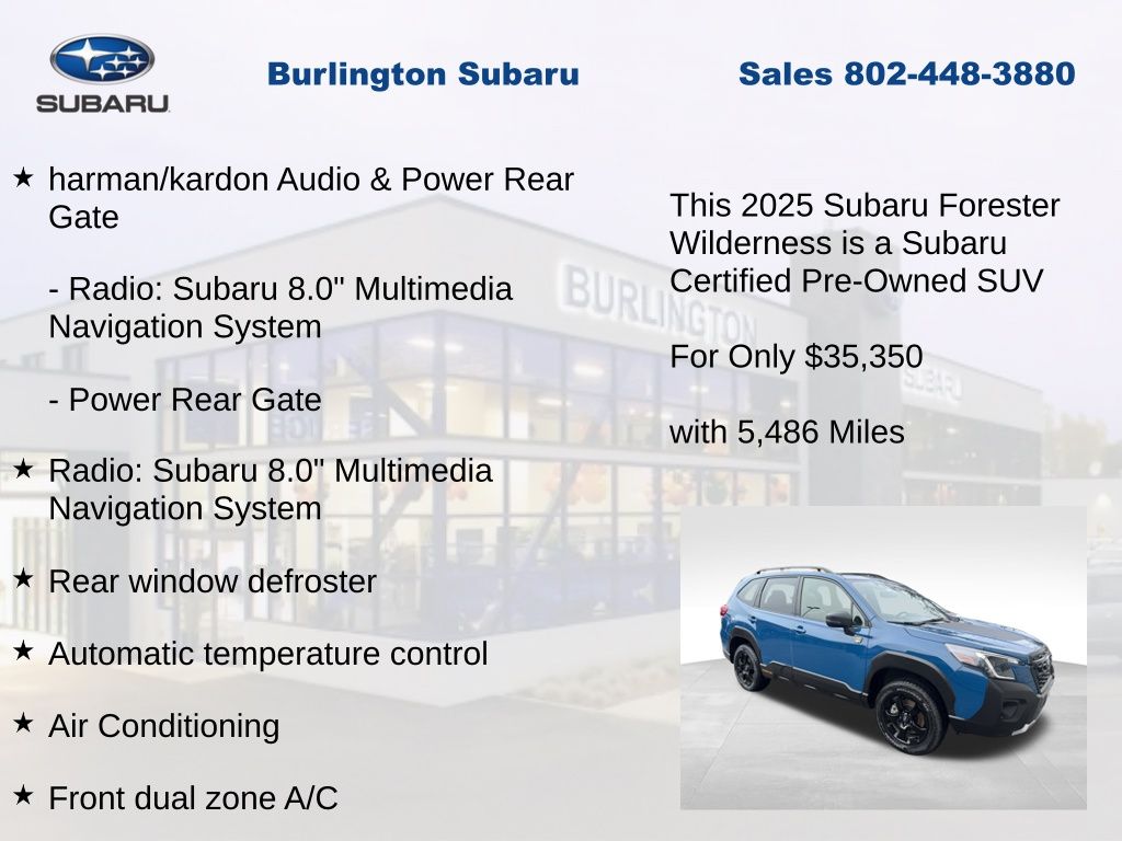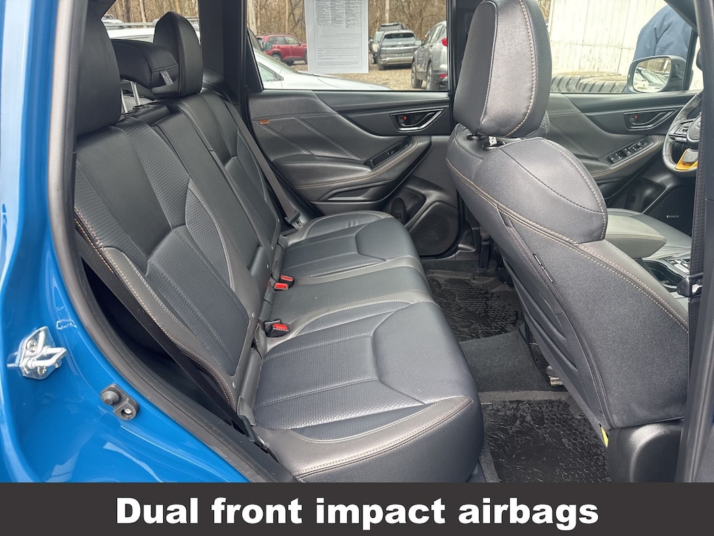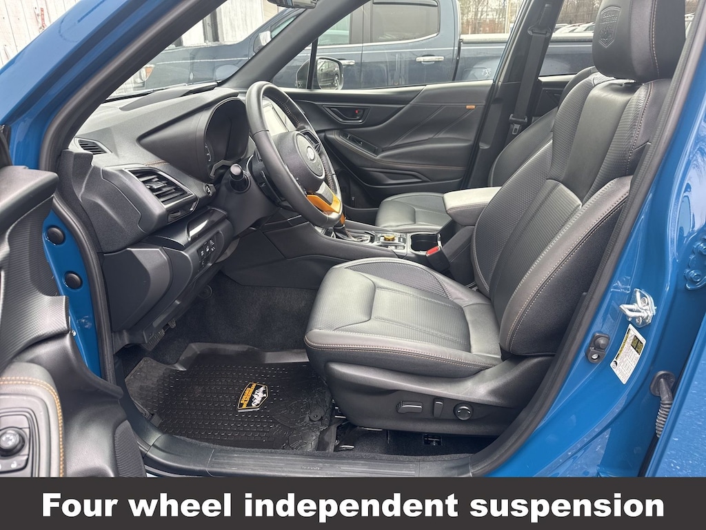 Clean CARFAX. Subaru Forester Wilderness 2025 Certified. 4-Wheel Disc Brakes, ABS brakes, Air Conditioning, Alloy wheels, Anti-whiplash front head restraints, Auto High-beam Headlights, Automatic temperature control, Brake assist, Driver vanity mirror, Dual front impact airbags, Dual front side impact airbags, Electronic Stability Control, Emergency communication system: MySubaru Safety (3-year free trial), Exterior Parking Camera Rear, Four wheel independent suspension, Front dual zone A/C, Front fog lights, Front reading lights, Fully automatic headlights, harman/kardon Audio & Power Rear Gate, Heated door mirrors, Heated Front Bucket Seats, Illuminated entry, Knee airbag, Leather Shift Knob, Leather steering wheel, Low tire pressure warning, Occupant sensing airbag, Outside temperature display, Overhead airbag, Panic alarm, Passenger vanity mirror, Power door mirrors, Power driver seat, Power moonroof: Panoramic, Power Rear Gate, Power steering, Power windows, Radio: Subaru 8.0" Multimedia Navigation System, Rear window defroster, Rear window wiper, Remote keyless entry, Speed control, Speed-sensing steering, Split folding rear seat, Steering wheel mounted audio controls, Tachometer, Telescoping steering wheel, Textured StarTex Upholstery, Tilt steering wheel, Traction control, Trip computer, Turn signal indicator mirrors, Variably intermittent wipers.
