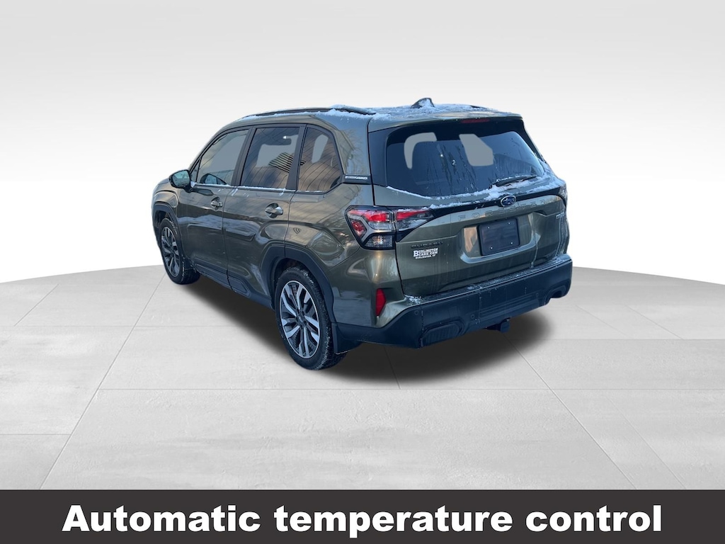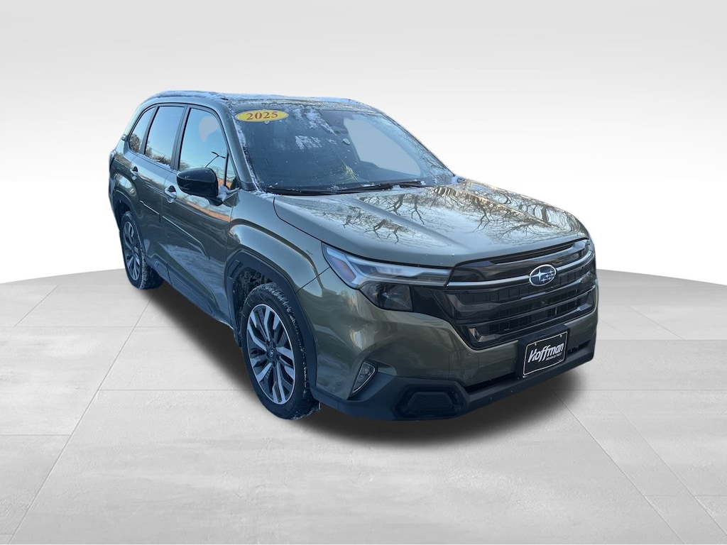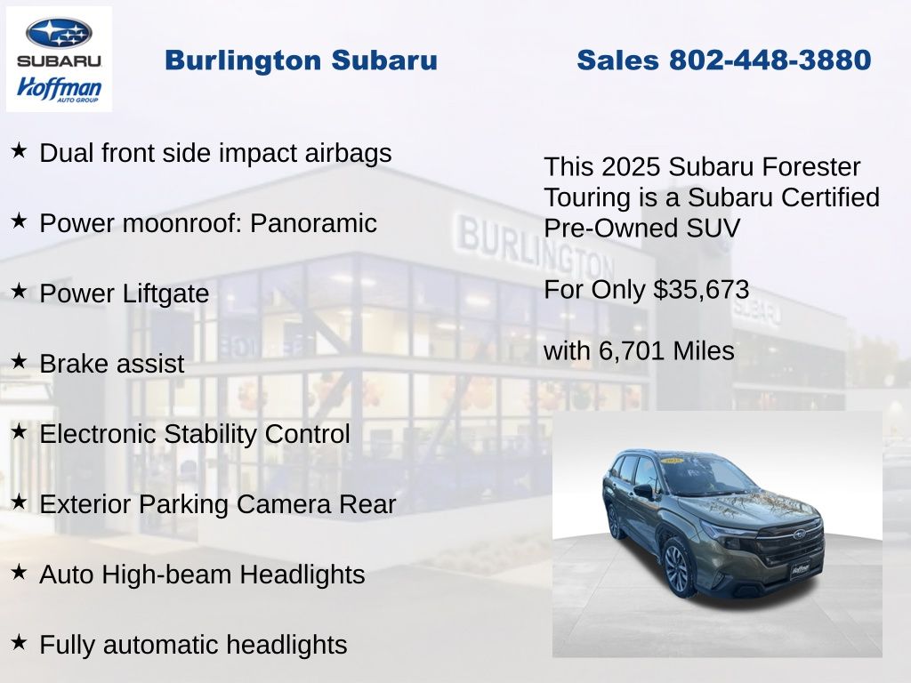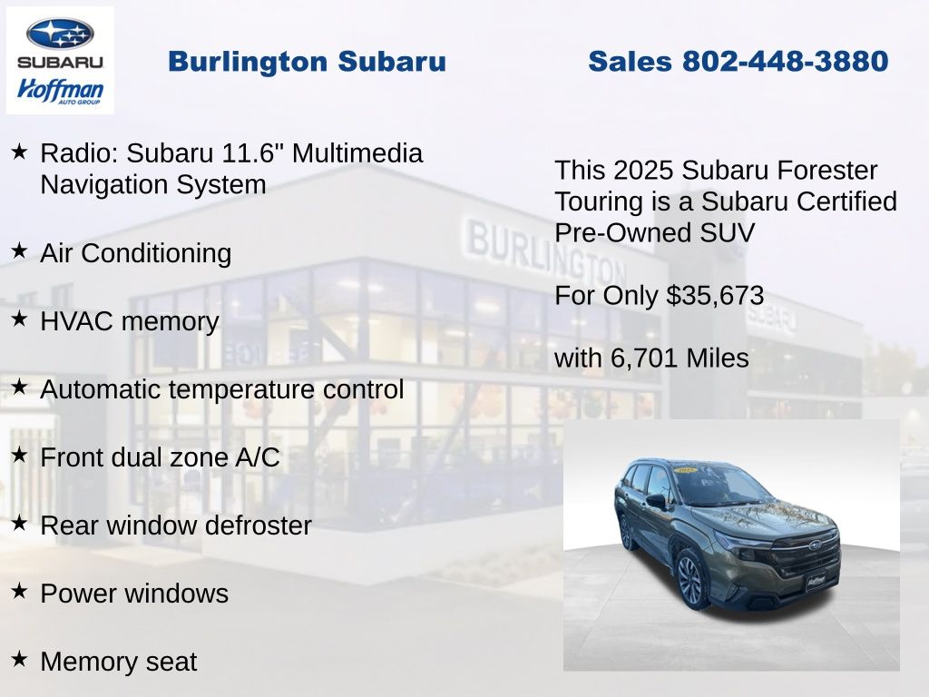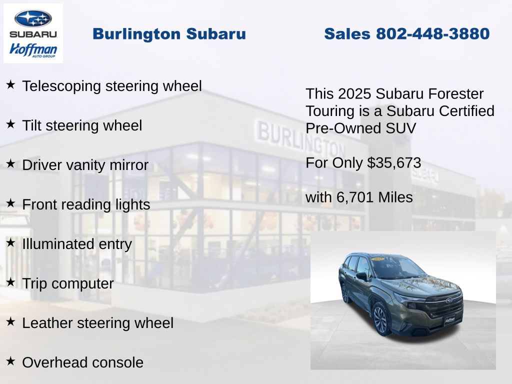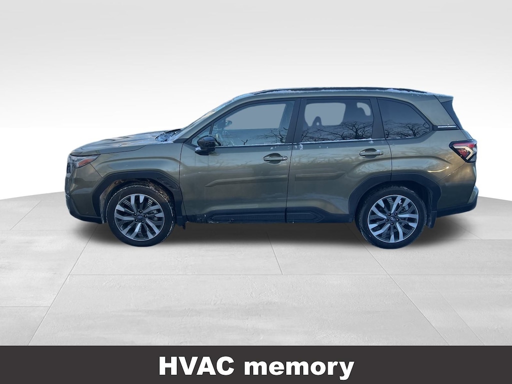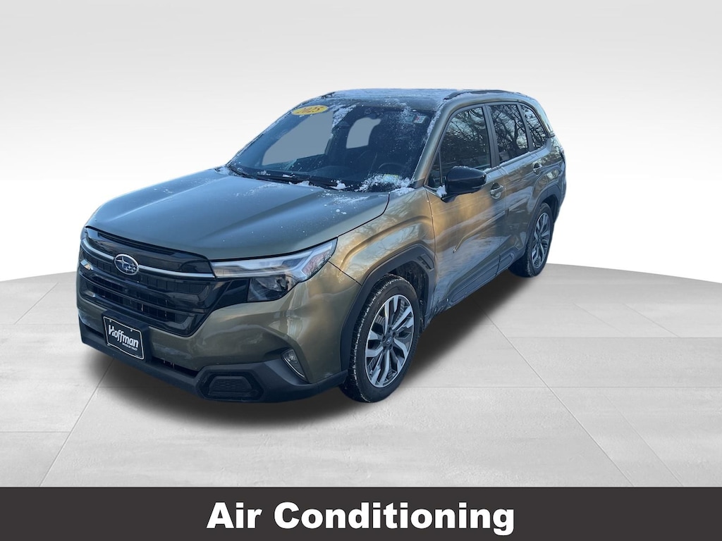 CARFAX One-Owner. Clean CARFAX. Subaru Forester Touring 2025 Certified. 4-Wheel Disc Brakes, ABS brakes, Air Conditioning, Alloy wheels, Anti-whiplash front head restraints, Auto High-beam Headlights, Automatic temperature control, Brake assist, Driver vanity mirror, Dual front impact airbags, Dual front side impact airbags, Electronic Stability Control, Emergency communication system: MySubaru Safety (3-year free trial), Exterior Parking Camera Rear, Four wheel independent suspension, Front dual zone A/C, Front fog lights, Front reading lights, Fully automatic headlights, Heated & Ventilated Front Bucket Seats, Heated door mirrors, Heated rear seats, Heated steering wheel, HVAC memory, Illuminated entry, Knee airbag, Leather steering wheel, Low tire pressure warning, Memory seat, Occupant sensing airbag, Outside temperature display, Overhead airbag, Overhead console, Panic alarm, Passenger vanity mirror, Perforated Leather-Trimmed Upholstery, Power door mirrors, Power driver seat, Power Liftgate, Power moonroof: Panoramic, Power passenger seat, Power steering, Power windows, Radio: Subaru 11.6" Multimedia Navigation System, Rear window defroster, Rear window wiper, Remote keyless entry, Speed control, Speed-sensing steering, Split folding rear seat, Steering wheel mounted audio controls, Tachometer, Telescoping steering wheel, Tilt steering wheel, Traction control, Trip computer, Turn signal indicator mirrors, Variably intermittent wipers, Ventilated front seats.
