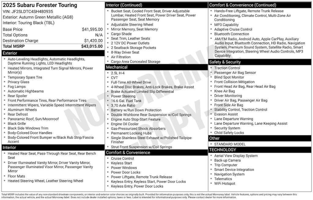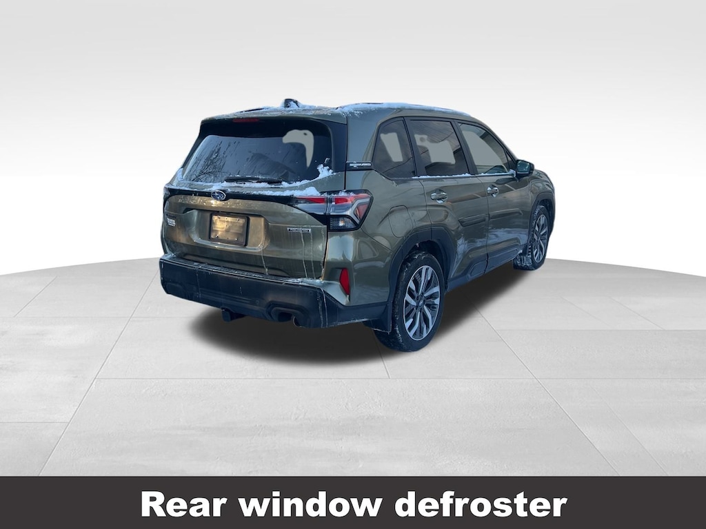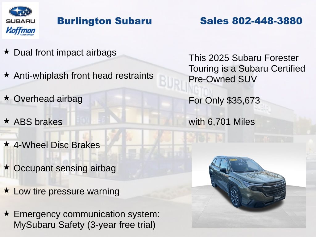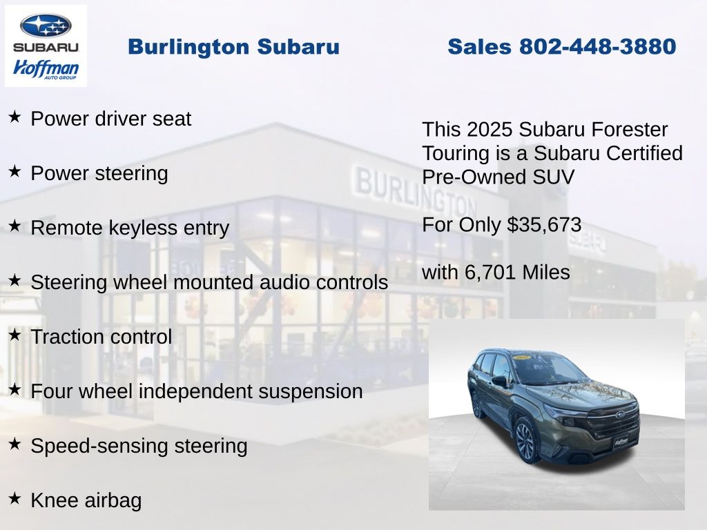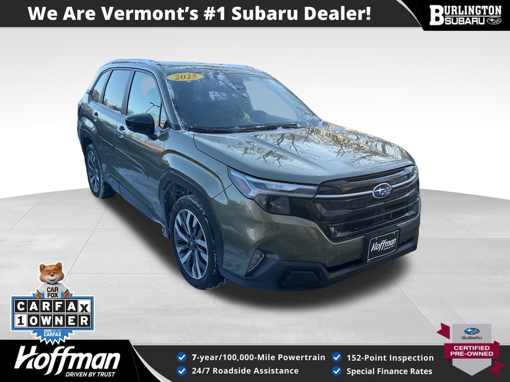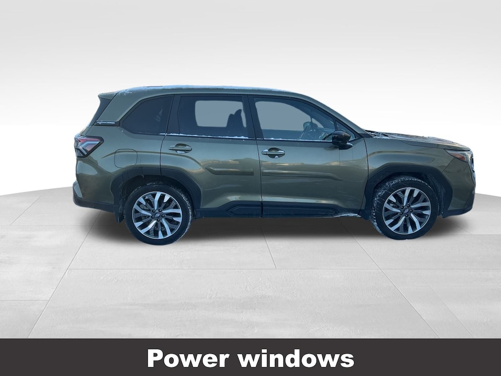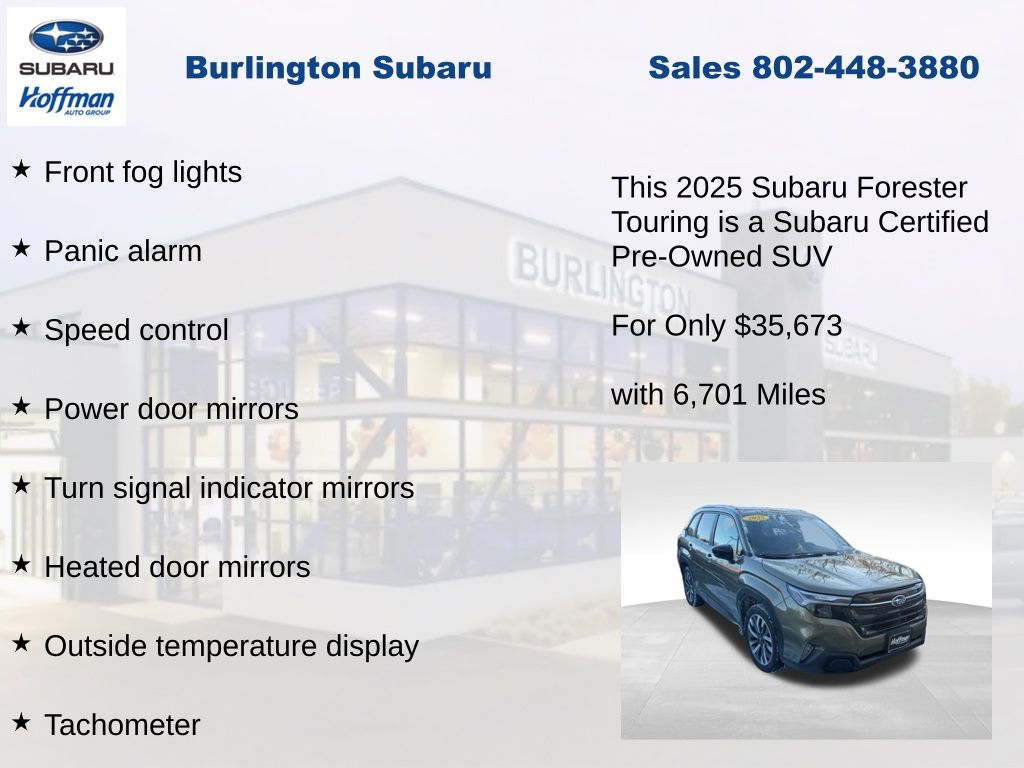 CARFAX One-Owner. Clean CARFAX. Subaru Forester Touring 2025 Certified. 4-Wheel Disc Brakes, ABS brakes, Air Conditioning, Alloy wheels, Anti-whiplash front head restraints, Auto High-beam Headlights, Automatic temperature control, Brake assist, Driver vanity mirror, Dual front impact airbags, Dual front side impact airbags, Electronic Stability Control, Emergency communication system: MySubaru Safety (3-year free trial), Exterior Parking Camera Rear, Four wheel independent suspension, Front dual zone A/C, Front fog lights, Front reading lights, Fully automatic headlights, Heated & Ventilated Front Bucket Seats, Heated door mirrors, Heated rear seats, Heated steering wheel, HVAC memory, Illuminated entry, Knee airbag, Leather steering wheel, Low tire pressure warning, Memory seat, Occupant sensing airbag, Outside temperature display, Overhead airbag, Overhead console, Panic alarm, Passenger vanity mirror, Perforated Leather-Trimmed Upholstery, Power door mirrors, Power driver seat, Power Liftgate, Power moonroof: Panoramic, Power passenger seat, Power steering, Power windows, Radio: Subaru 11.6" Multimedia Navigation System, Rear window defroster, Rear window wiper, Remote keyless entry, Speed control, Speed-sensing steering, Split folding rear seat, Steering wheel mounted audio controls, Tachometer, Telescoping steering wheel, Tilt steering wheel, Traction control, Trip computer, Turn signal indicator mirrors, Variably intermittent wipers, Ventilated front seats.