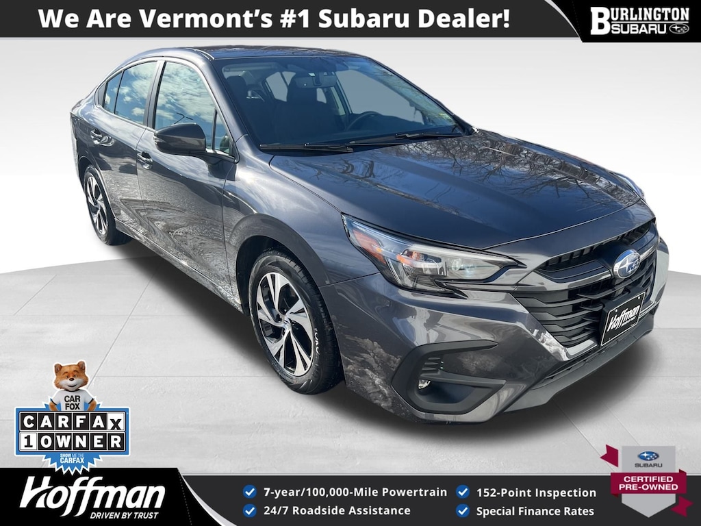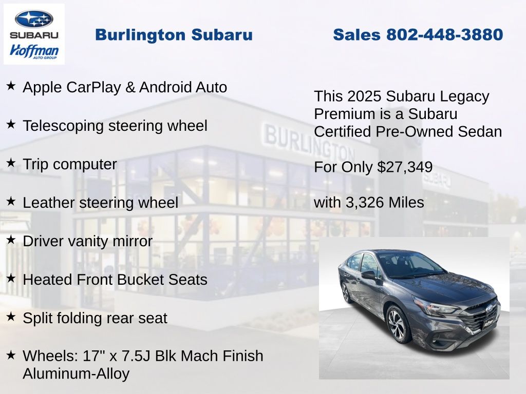 CARFAX One-Owner. Clean CARFAX. Subaru Legacy Premium 2025 Certified. 4-Wheel Disc Brakes, ABS brakes, Air Conditioning, Alloy wheels, Anti-whiplash front head restraints, Apple CarPlay & Android Auto, Auto High-beam Headlights, Automatic temperature control, Brake assist, Driver vanity mirror, Dual front impact airbags, Dual front side impact airbags, Electronic Stability Control, Emergency communication system: MySubaru Safety Plus (3-year free trial included), Exterior Parking Camera Rear, Four wheel independent suspension, Front dual zone A/C, Front reading lights, Fully automatic headlights, Heated door mirrors, Heated Front Bucket Seats, Illuminated entry, Knee airbag, Leather steering wheel, Low tire pressure warning, Occupant sensing airbag, Outside temperature display, Overhead airbag, Panic alarm, Passenger vanity mirror, Power door mirrors, Power driver seat, Power steering, Power windows, Radio: Subaru 11.6" Multimedia Plus System, Rear anti-roll bar, Rear window defroster, Remote keyless entry, Speed control, Speed-sensing steering, Split folding rear seat, Steering wheel mounted audio controls, Tachometer, Telescoping steering wheel, Tilt steering wheel, Traction control, Trip computer, Turn signal indicator mirrors, Variably intermittent wipers, Wheels: 17" x 7.5J Blk Mach Finish Aluminum-Alloy. Odometer is 559 miles below market average!