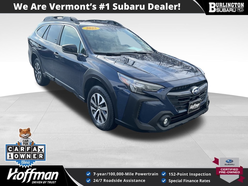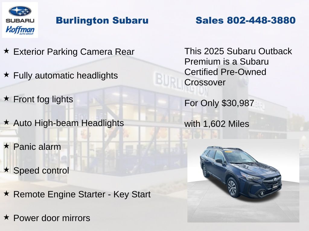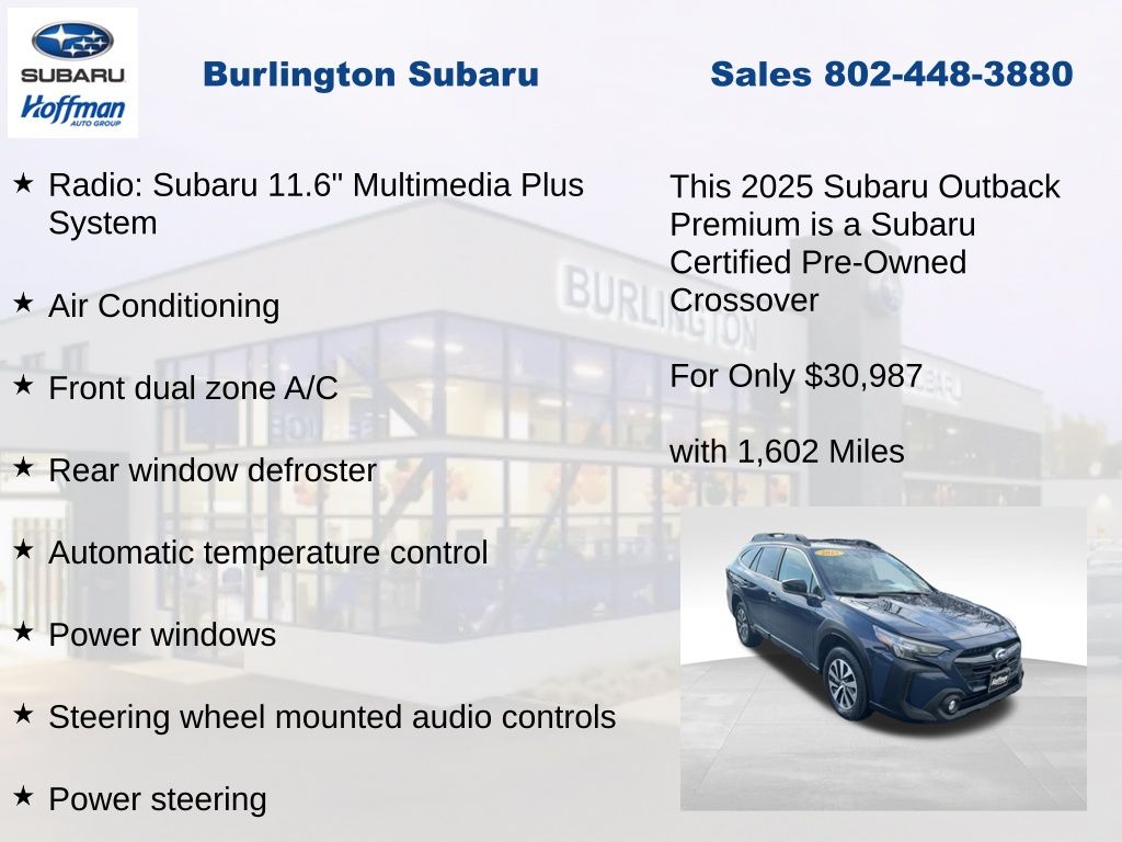 CARFAX One-Owner. Clean CARFAX. Subaru Outback Premium 2025 Certified. 4-Wheel Disc Brakes, ABS brakes, Air Conditioning, Alloy wheels, Apple CarPlay & Android Auto, Auto High-beam Headlights, Automatic temperature control, Brake assist, Driver vanity mirror, Dual front impact airbags, Dual front side impact airbags, Electronic Stability Control, Emergency communication system: MySubaru Safety (3-year free trial), Exterior Parking Camera Rear, Four wheel independent suspension, Front dual zone A/C, Front fog lights, Front reading lights, Fully automatic headlights, Heated door mirrors, Heated Front Bucket Seats, Illuminated entry, Knee airbag, Leather Shift Knob, Leather steering wheel, Low tire pressure warning, Occupant sensing airbag, Outside temperature display, Overhead airbag, Overhead console, Panic alarm, Passenger vanity mirror, Power door mirrors, Power driver seat, Power steering, Power windows, Radio: Subaru 11.6" Multimedia Plus System, Rear window defroster, Rear window wiper, Remote Engine Starter - Key Start, Remote keyless entry, Speed control, Speed-sensing steering, Split folding rear seat, Steering wheel mounted audio controls, Tachometer, Telescoping steering wheel, Tilt steering wheel, Traction control, Trip computer, Turn signal indicator mirrors, Variably intermittent wipers. Odometer is 3166 miles below market average!