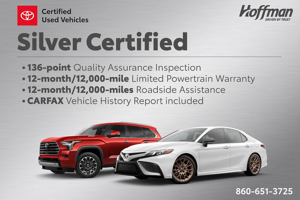 * SILVER CERTIFIED Eligibility: Vehicles up to 10 Model Years Old & Between 60,000-125,000 Miles on Odometer; Outside Gold Eligibility Parameters, Limited Powertrain Warranty: 12-Month/12,000-Mile(2), 24-Hour Roadside Assistance: 12-Month/12,000-Mile(3), Extended Warranty Coverage (items 2 and 3 above) Transferable at No Cost For Added Resale Value, Quality Assurance Inspection: 136-Point Minimum, Free CARFAX Vehicle History Report, Warranty Honored at Over 1,400 Toyota Dealers in the Continental U.S. and Canada, Trade-Ins Accepted, Trouble-free Handling of Your Transaction; Including DMV Paperwork