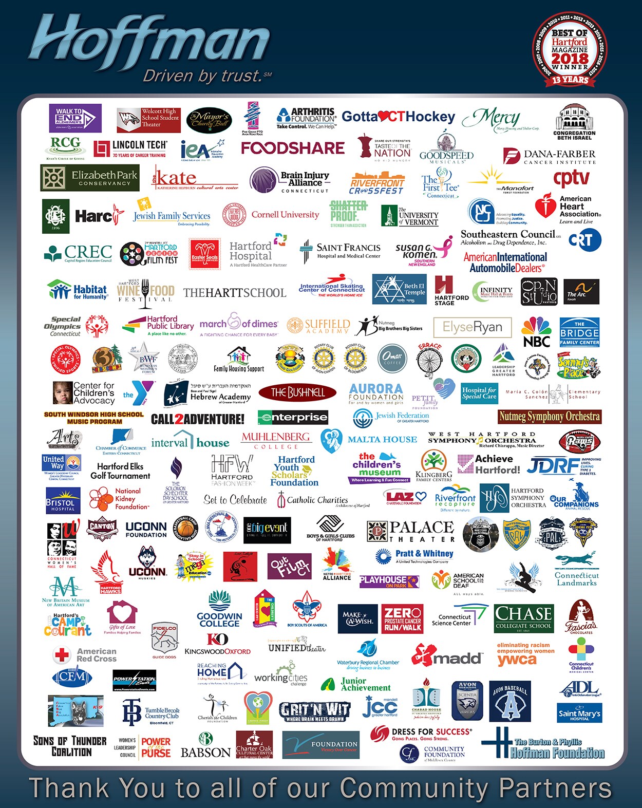 If you've ever shopped with us here at Hoffman Toyota, be it for your very first new Toyota or maybe a little TLC for your longtime daily driver in our Service Center, we hope you saw why we live by the motto Driven by trust. We try to put integrity, respect, and honesty into everything we do because we care about our community and our place within it! There are no strong businesses without strong communities, so here on this page, you can see just some of the partnerships and alliances we've made with organizations throughout the state as well as the nation! We're proud to give back to the community that has helped us be as successful as we have been, so here's a big BIG "Thank You!" to our Community Partners, and here's to strong partnerships and strong communities in the future!