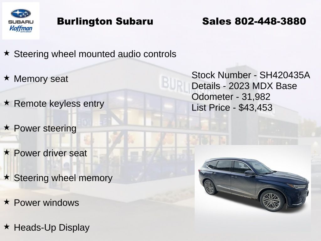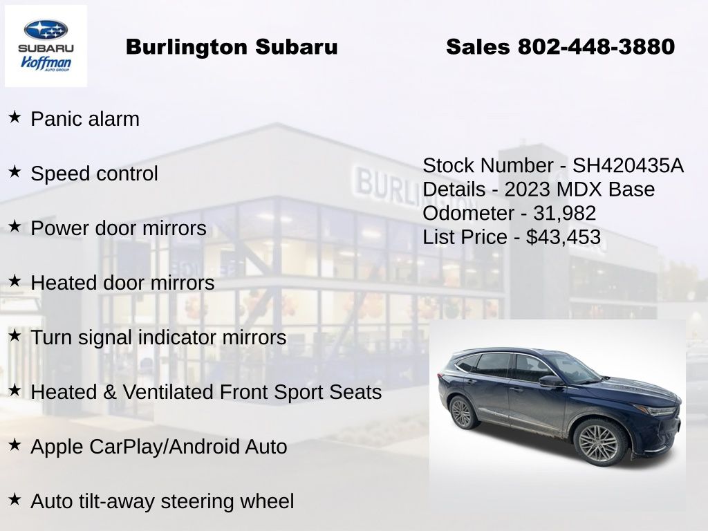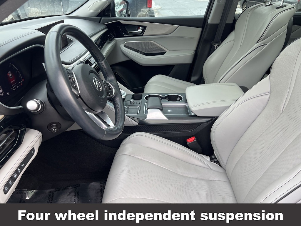 CARFAX One-Owner. Clean CARFAX. Acura MDX Advance 2023 3rd row seats: split-bench, 4-Wheel Disc Brakes, A/V remote: CabinControl, ABS brakes, Adaptive suspension, Air Conditioning, Alloy wheels, Anti-whiplash front head restraints, Apple CarPlay/Android Auto, Auto High-beam Headlights, Auto tilt-away steering wheel, Auto-dimming Rear-View mirror, Automatic temperature control, Brake assist, Compass, Delay-off headlights, Driver vanity mirror, Dual front impact airbags, Dual front side impact airbags, Electronic Stability Control, Emergency communication system: AcuraLink, Four wheel independent suspension, Front Bucket Seats, Front Center Armrest, Front dual zone A/C, Front fog lights, Front reading lights, Fully automatic headlights, Garage door transmitter: HomeLink, Heads-Up Display, Heated & Ventilated Front Sport Seats, Heated door mirrors, Heated front seats, Heated rear seats, Heated steering wheel, HVAC memory, Illuminated entry, Knee airbag, Lane departure: Lane Keeping Assist System (LKAS) active, Leather steering wheel, Low tire pressure warning, Memory seat, Navigation system: Acura Navigation System with 3D View, Occupant sensing airbag, Outside temperature display, Overhead airbag, Overhead console, Panic alarm, Passenger vanity mirror, Perforated Premium Milano Leather Trimmed Seats, Power door mirrors, Power driver seat, Power Liftgate, Power moonroof, Power passenger seat, Power steering, Power windows, Premium audio system: Acura/ELS Studio 3D, Rain sensing wipers, Rear air conditioning, Rear reading lights, Rear seat center armrest, Rear window defroster, Rear window wiper, Remote keyless entry, Speed control, Speed-sensing steering, Speed-Sensitive Wipers, Split folding rear seat, Steering wheel memory, Steering wheel mounted audio controls, Tachometer, Telescoping steering wheel, Tilt steering wheel, Traction control, Trip computer, Turn signal indicator mirrors, Variably intermittent wipers, Ventilated front seats. Odometer is 9128 miles below market average!