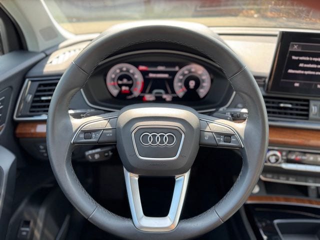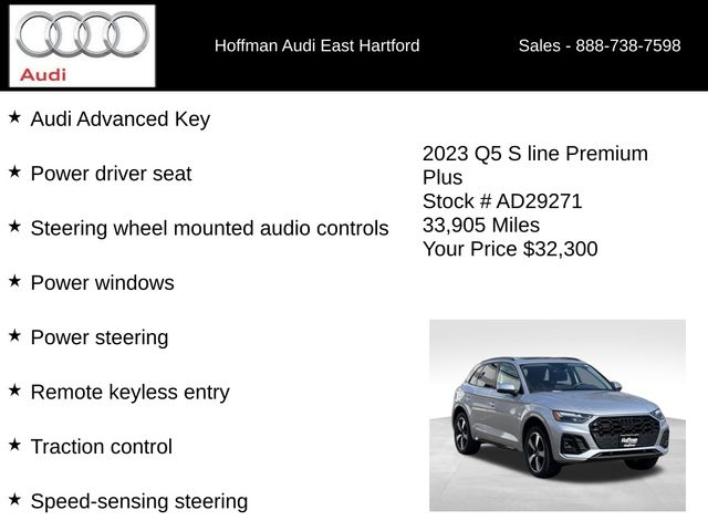 PREMIUM PLUS PKG, ONE OWNER, CLEAN CARFAX...NO ACCIDENTS, AUDI CERTIFIED, HOFFMAN NEW CAR TRADE, 6 MONTHS/6000 MILES POWERTRAIN WARRANTY, 10 Speakers, 4-Wheel Disc Brakes, 5.302 Axle Ratio, ABS brakes, Air Conditioning, Alloy wheels, AM/FM radio, Audi Active Lane Assist, Audi Advanced Key, Audi Beam-Rings, Audi Guard All-Weather Floor Mats (Set of 4), Audi Guard Wheel Lock Kit, Audi Virtual Cockpit Plus, Auto-Dimming Power Folding Exterior Mirrors, Auto-dimming Rear-View mirror, Automatic temperature control, Bang & Olufsen Sound System w/3D Sound, Black Audi Rings & Badges, Black Exterior Trim, Black Optic Package, Black Roof Rails, Brake assist, Bumpers: body-color, Compass, Convenience Package, Delay-off headlights, Driver door bin, Driver Seat Memory, Driver vanity mirror, Dual front impact airbags, Dual front side impact airbags, Electronic Stability Control, Emergency communication system: Audi connect CARE, Exterior Parking Camera Rear, Four wheel independent suspension, Front anti-roll bar, Front Bucket Seats, Front Center Armrest, Front dual zone A/C, Front fog lights, Front reading lights, Garage door transmitter: HomeLink, Genuine wood console insert, Genuine wood dashboard insert, Genuine wood door panel insert, Hands-On Detection Steering Wheel, Heated 8-Way Power Front Bucket Seats, Heated door mirrors, Heated front seats, Heated Steering Wheel, Illuminated entry, Integrated Toll Module Delete (DISC), Leather Seating Surfaces, Leather Shift Knob, Leatherette Covered Center Console & Door Armrests, Low tire pressure warning, Occupant sensing airbag, Outside temperature display, Overhead airbag, Overhead console, Panic alarm, Panoramic Sunroof, Passenger door bin, Passenger vanity mirror, Power Adjustable Steering Column, Power door mirrors, Power driver seat, Power Liftgate, Power passenger seat, Power steering, Power windows, Premium Plus Package, Privacy Trunk Cover, Radio data system, Radio: Audi Sound System, Rain sensing wipers, Rear air conditioning, Rear anti-roll bar, Rear fog lights, Rear reading lights, Rear seat center armrest, Rear window defroster, Rear window wiper, Remote keyless entry, Roof rack, Security system, SiriusXM w/360L, Speed control, Speed-sensing steering, Speed-Sensitive Wipers, Split folding rear seat, Spoiler, Steering wheel mounted audio controls, Tachometer, Telescoping steering wheel, Tilt steering wheel, Top View Camera System, Traction control, Traffic Jam Assist, Trip computer, Turn signal indicator mirrors, Variably intermittent wipers, Wheels: 18" 5-Arm-Turbine Design, Wheels: 19" 5-Double-Arm Design Bi-Color Finish, Wheels: 20" 5-Arm Cutter Design, Bi-Color Finish. CARFAX One-Owner. Clean CARFAX. Florett Silver Metallic 2023 Audi Q5 45 S line Premium quattro quattro 7-Speed Automatic S tronic 2.0L Turbocharged