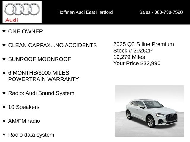ONE OWNER, CLEAN CARFAX...NO ACCIDENTS, SUNROOF MOONROOF, 6 MONTHS/6000 MILES POWERTRAIN WARRANTY, 10 Speakers, 4-Wheel Disc Brakes, ABS brakes, Air Conditioning, Alloy wheels, AM/FM radio, Audi smartphone interface (Apple CarPlay/Android Auto), Auto High-beam Headlights, Automatic temperature control, Brake assist, Bumpers: body-color, Delay-off headlights, Driver door bin, Driver vanity mirror, Dual front impact airbags, Dual front side impact airbags, Electronic Stability Control, Emergency communication system: Audi connect CARE, Exterior Parking Camera Rear, Four wheel independent suspension, Front anti-roll bar, Front Bucket Seats, Front Center Armrest, Front dual zone A/C, Front fog lights, Front reading lights, Fully automatic headlights, Heated door mirrors, Heated Front Bucket Seats, Heated front seats, Illuminated entry, Knee airbag, Leather Seating Surfaces, Leather Shift Knob, Leather steering wheel, Low tire pressure warning, Occupant sensing airbag, Outside temperature display, Overhead airbag, Overhead console, Panic alarm, Passenger door bin, Passenger vanity mirror, Power door mirrors, Power driver seat, Power Liftgate, Power moonroof: Panoramic, Power passenger seat, Power steering, Power windows, Radio data system, Radio: Audi Sound System, Rain sensing wipers, Rear air conditioning, Rear anti-roll bar, Rear reading lights, Rear seat center armrest, Rear window defroster, Rear window wiper, Remote keyless entry, Speed control, Speed-sensing steering, Split folding rear seat, Spoiler, Steering wheel mounted audio controls, Tachometer, Telescoping steering wheel, Tilt steering wheel, Traction control, Trip computer, Turn signal indicator mirrors, Variably intermittent wipers, Wheels: 18" 5-V-Spoke-S Design. CARFAX One-Owner. Clean CARFAX. Glacier White Metallic 2025 Audi Q3 Premium S Line quattro quattro 8-Speed Automatic with Tiptronic 2.0L 4-Cylinder TFSI