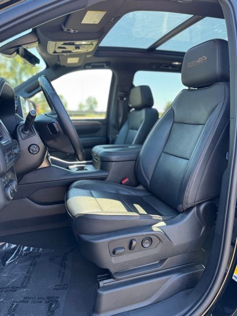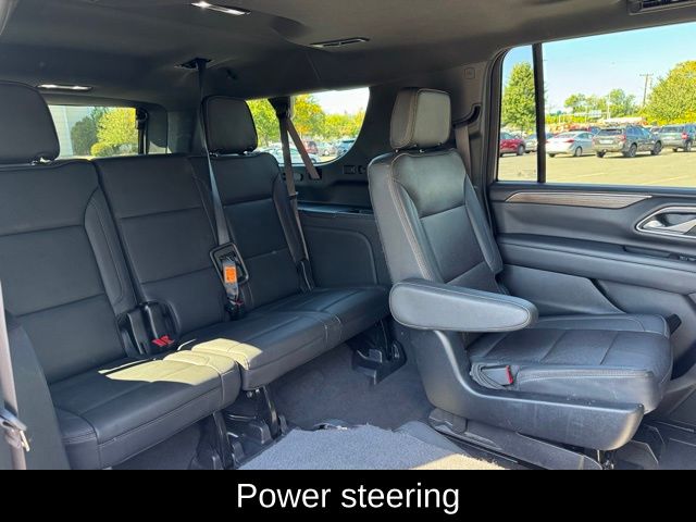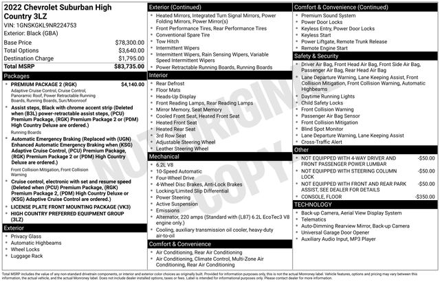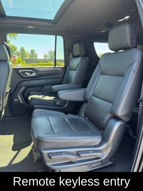6 MONTHS/6000 MILES POWERTRAIN WARRANTY, 10 Speakers, 15" Diagonal Multi-Color Head-Up Display, 1st & 2nd Row Color-Keyed Carpeted Floor Mats, 2-Speed Active Electronic AutoTrac Transfer Case, 3rd Row 60/40 Power-Folding Split-Bench, 3rd row seats: split-bench, 4-Wheel Disc Brakes, ABS brakes, Adaptive Cruise Control, Adaptive suspension, Air Conditioning, AM/FM radio: SiriusXM with 360L, Apple CarPlay/Android Auto, Auto High-beam Headlights, Auto-dimming door mirrors, Auto-dimming Rear-View mirror, Auto-leveling suspension, Automatic Stop/Start, Automatic temperature control, Bose 10-Speaker Surround w/CenterPoint, Brake assist, Bright Front & Rear Door Sill Plates, Bumpers: body-color, Chrome Door Handles w/Body-Color Strip, Color-Keyed Carpeting Floor Covering, Compass, Delay-off headlights, Driver & Front Outboard Passenger Airbags, Driver door bin, Driver vanity mirror, Dual Exhaust System, Dual front impact airbags, Dual front side impact airbags, Dual-Pane Power Panoramic Sunroof, Electronic Stability Control, Emergency communication system: OnStar and Chevrolet connected services capable, Enhanced Automatic Emergency Braking, Enhanced Driver Information Center, Floor Console, Floor Console w/Storage Area, Four wheel independent suspension, Front & Rear Park Assist, Front anti-roll bar, Front Bucket Seats, Front Center Armrest, Front dual zone A/C, Front reading lights, Fully automatic headlights, Garage door transmitter, Hands-Free Rear Power Programmable Liftgate, HD Surround Vision, Heads-Up Display, Heated & Ventilated Driver & Front Passenger Seats, Heated 2nd Row Outboard Seats, Heated door mirrors, Heated Driver & Front Passenger Seats, Heated front seats, Heated rear seats, Heated Steering Wheel, Heated steering wheel, Hill Descent Control, Illuminated entry, Infotainment Display, Inside Rearview Auto-Dimming Rear Camera Mirror, Lane Change Alert w/Side Blind Zone Alert, Leather steering wheel, Leather-Wrapped Steering Wheel, LED Daytime Running Lamps, License Plate Front Mounting Package, Low tire pressure warning, Magnetic Ride Control Suspension, Memory seat, Memory Settings, Navigation System, Not Equipped w/4-Way Driver & Fr Pass Pwr Lumbar, Not Equipped w/Front & Rear Park Assist, Not Equipped w/Steering Column Lock, Occupant sensing airbag, Outside Heated Power-Adjustable Mirrors, Outside temperature display, Overhead airbag, Overhead console, Panic alarm, Passenger door bin, Passenger vanity mirror, Perforated Leather Seating Surfaces, Power door mirrors, Power driver seat, Power Liftgate, Power passenger seat, Power Release 2nd Row Bucket Seats, Power steering, Power Tilt & Telescopic Steering Column, Power windows, Power-Retractable Assist Steps, Preferred Equipment Group 3LZ, Premium audio system: Chevrolet Infotainment 3 Premium, Premium Package 2, Radio: Chevrolet Infotainment 3 Premium System, Rear air conditioning, Rear anti-roll bar, Rear Camera Mirror Washer, Rear Cross Traffic Alert, Rear Pedestrian Alert, Rear reading lights, Rear window defroster, Remote keyless entry, Remote Start, Roof rack: rails only, Safety Alert Seat, Security system, SiriusXM Radio w/360L, Speed control, Speed-sensing steering, Split folding rear seat, Spoiler, Start/Stop System Disable Button, Steering wheel memory, Steering wheel mounted audio controls, Tachometer, Telescoping steering wheel, Tilt steering wheel, Traction control, Trip computer, Turn signal indicator mirrors, Universal Home Remote, Ventilated front seats, Voltmeter, Wireless Charging. CARFAX One-Owner. Black 2022 Chevrolet Suburban High Country 4W