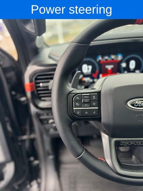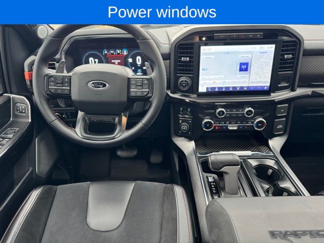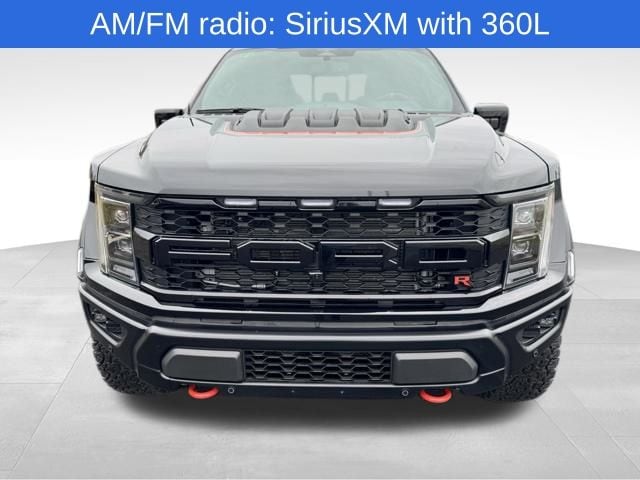 F-150 Raptor R, 5.2L V8, Agate Black Metallic, 17" Forged Aluminum Bead-Lock Capable Wheels, 18 Speakers, 4-Wheel Disc Brakes, ABS brakes, Adaptive suspension, Adjustable pedals, Air Conditioning, AM/FM radio: SiriusXM with 360L, Auto High-beam Headlights, Auto tilt-away steering wheel, Auto-dimming Rear-View mirror, Automatic temperature control, Black Exterior Accents, Brake assist, Carbon Fiber Interior Appliques, Code Orange Stitching Doors & Instrument Panel, Code Orange Tow Hooks, Compass, Delay-off headlights, Driver door bin, Driver vanity mirror, Dual front impact airbags, Dual front side impact airbags, Electronic Locking w/4.10 Axle Ratio, Electronic Stability Control, Emergency communication system, Equipment Group 802A Raptor R, Exterior Parking Camera Rear, Front anti-roll bar, Front Bucket Seats, Front Center Armrest, Front dual zone A/C, Front fog lights, Front reading lights, Front wheel independent suspension, Fully automatic headlights, Garage door transmitter, GVWR: 7,300 lbs Payload Package, GVWR: 7,450 lbs Payload Package, Heated front seats, Heated rear seats, Inclination/Intrusion Sensor Removal, Interior Code Orange Raptor R Badging, Lane Departure Warning System, Leather Trim Seats w/Heated 2nd Row, Low tire pressure warning, Memory seat, Moonroof & Tailgate, Navigation system: Connected Navigation, Occupant sensing airbag, Outside temperature display, Overhead airbag, Overhead console, Panic alarm, Partitioned Lockable Fold-Flat Storage, Passenger vanity mirror, Pedal memory, Power door mirrors, Power driver seat, Power passenger seat, Power steering, Power Tailgate, Power windows, Radio data system, Radio: B&O Unleashed Sound System by Bang & Olufsen, Rain sensing wipers, Raptor R Badge Tailgate Applique, Raptor R Exterior Graphics, Rear reading lights, Rear window defroster, Recaro Black w/Orange Stitching Front Seats, Remote keyless entry, Security system, Speed-sensing steering, Split folding rear seat, Steering Wheel Heat Removal (DISC), Steering wheel memory, Steering wheel mounted audio controls, SYNC 4 w/Enhanced Voice Recognition, Tachometer, Telescoping steering wheel, Tilt steering wheel, Tough Bed Spray-In Bedliner, Traction control, Trip computer, Turn signal indicator mirrors, Twin Panel Moonroof, Unique Hood Vent w/R Badge, Unique Raptor R Grille w/R Badge, Variably intermittent wipers, Ventilated front seats.