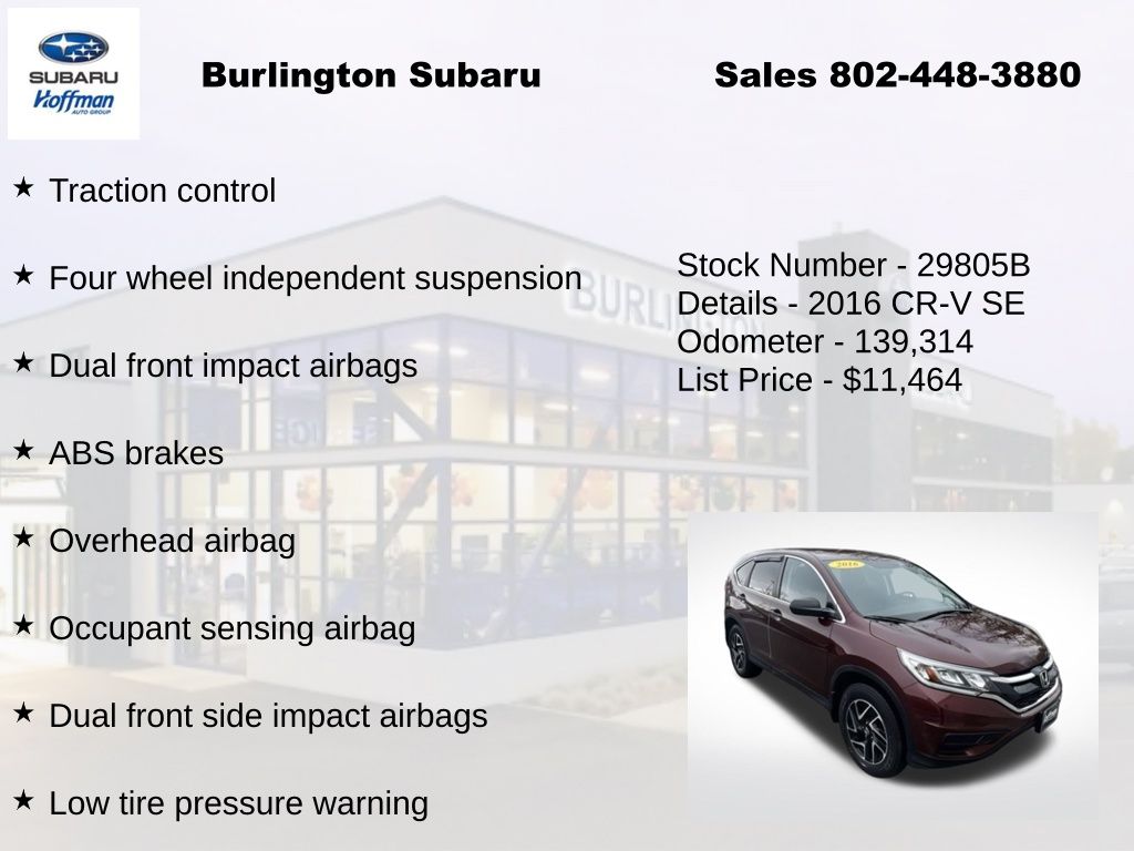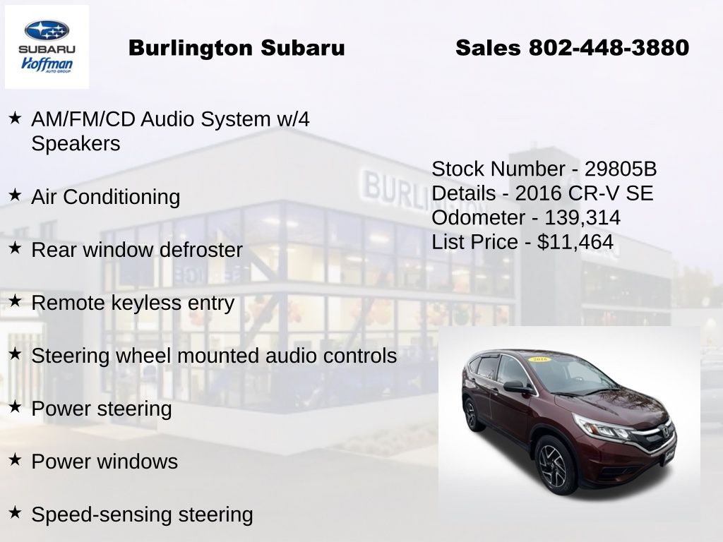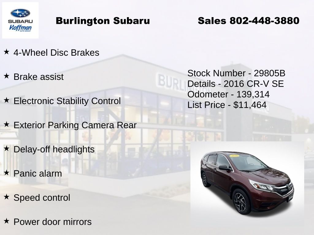 Clean CARFAX. Honda CR-V SE 2016 4-Wheel Disc Brakes, ABS brakes, Air Conditioning, Alloy wheels, AM/FM/CD Audio System w/4 Speakers, Brake assist, Compass, Delay-off headlights, Driver vanity mirror, Dual front impact airbags, Dual front side impact airbags, Electronic Stability Control, Exterior Parking Camera Rear, Four wheel independent suspension, Front Center Armrest, Front reading lights, Illuminated entry, Low tire pressure warning, Occupant sensing airbag, Outside temperature display, Overhead airbag, Overhead console, Panic alarm, Passenger vanity mirror, Power door mirrors, Power steering, Power windows, Rear seat center armrest, Rear window defroster, Rear window wiper, Remote keyless entry, Speed control, Speed-sensing steering, Split folding rear seat, Steering wheel mounted audio controls, Tachometer, Telescoping steering wheel, Tilt steering wheel, Traction control, Trip computer.