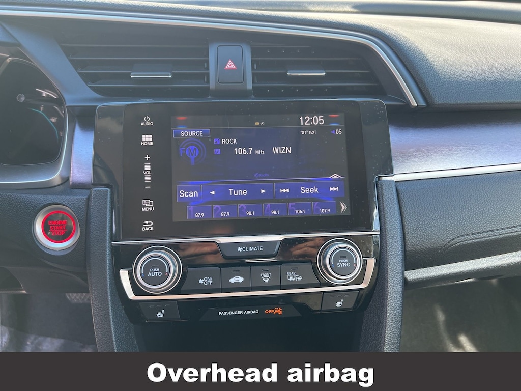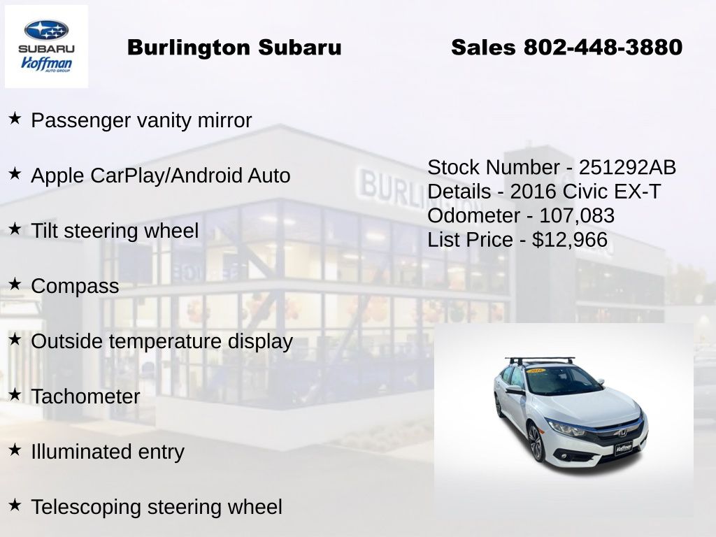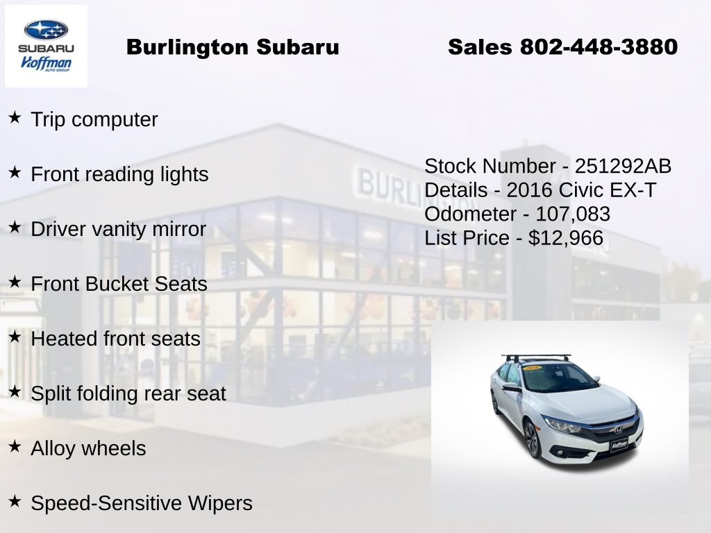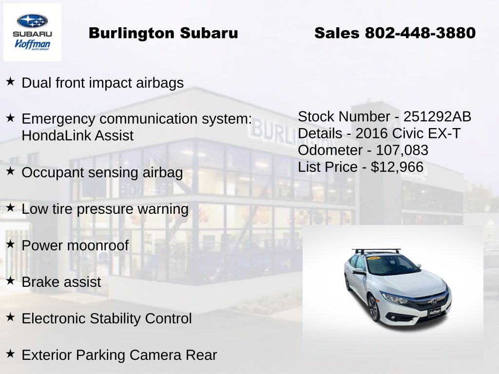 Clean CARFAX. Honda Civic EX-T 2016 4-Wheel Disc Brakes, ABS brakes, Air Conditioning, Alloy wheels, Apple CarPlay/Android Auto, Automatic temperature control, Brake assist, Compass, Delay-off headlights, Driver vanity mirror, Dual front impact airbags, Dual front side impact airbags, Electronic Stability Control, Emergency communication system: HondaLink Assist, Exterior Parking Camera Rear, Four wheel independent suspension, Front Bucket Seats, Front dual zone A/C, Front fog lights, Front reading lights, Fully automatic headlights, Heated door mirrors, Heated front seats, Illuminated entry, Low tire pressure warning, Occupant sensing airbag, Outside temperature display, Overhead airbag, Panic alarm, Passenger vanity mirror, Power door mirrors, Power moonroof, Power steering, Power windows, Radio: 180-Watt AM/FM/HD/SiriusXM Audio System, Rear window defroster, Reclining Heated Front Bucket Seats, Remote keyless entry, Speed control, Speed-sensing steering, Speed-Sensitive Wipers, Split folding rear seat, Steering wheel mounted audio controls, Tachometer, Telescoping steering wheel, Tilt steering wheel, Traction control, Trip computer, Variably intermittent wipers.