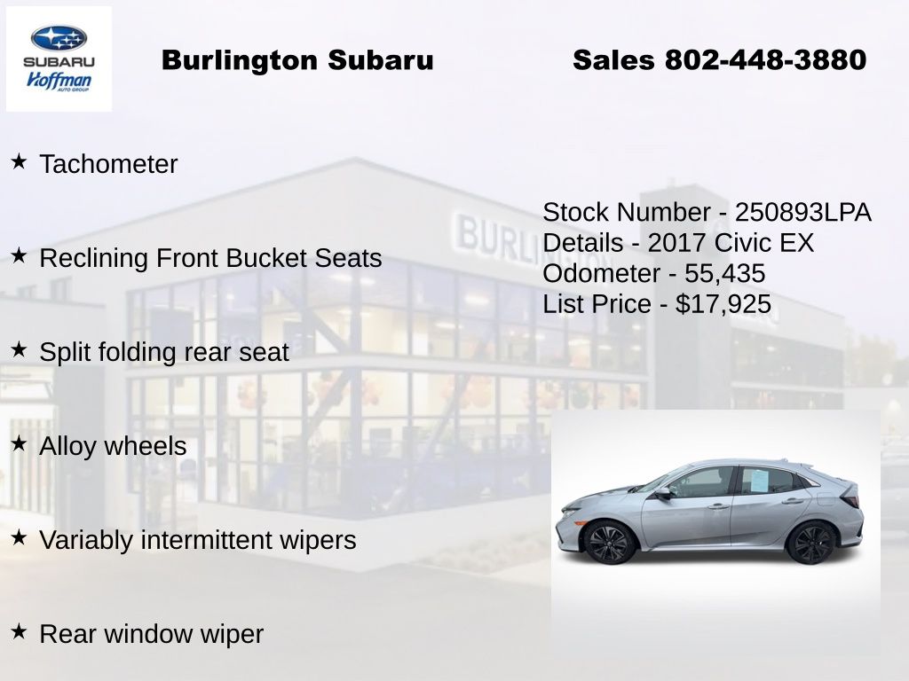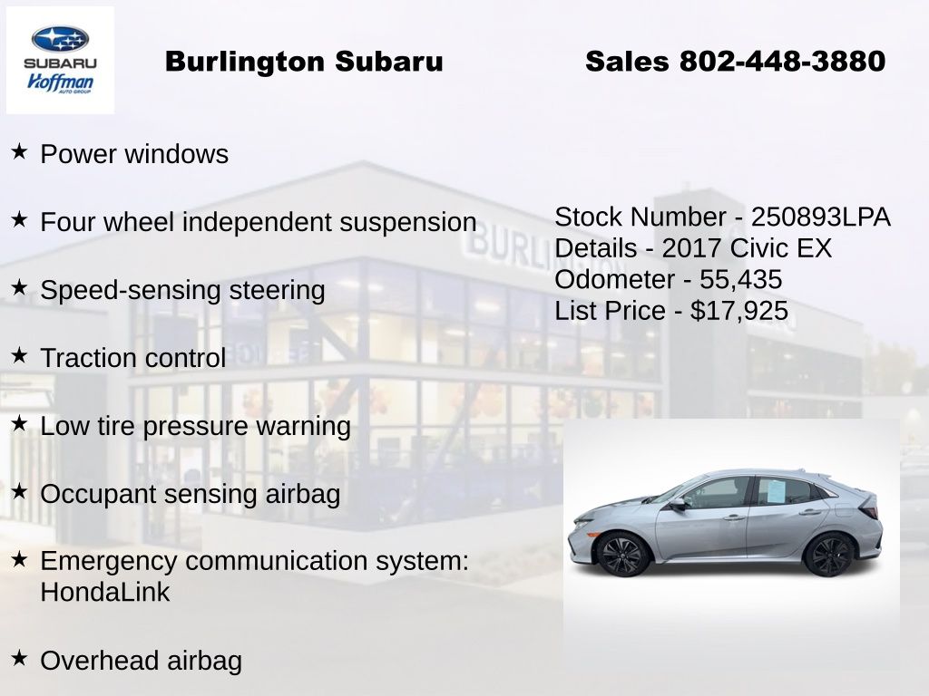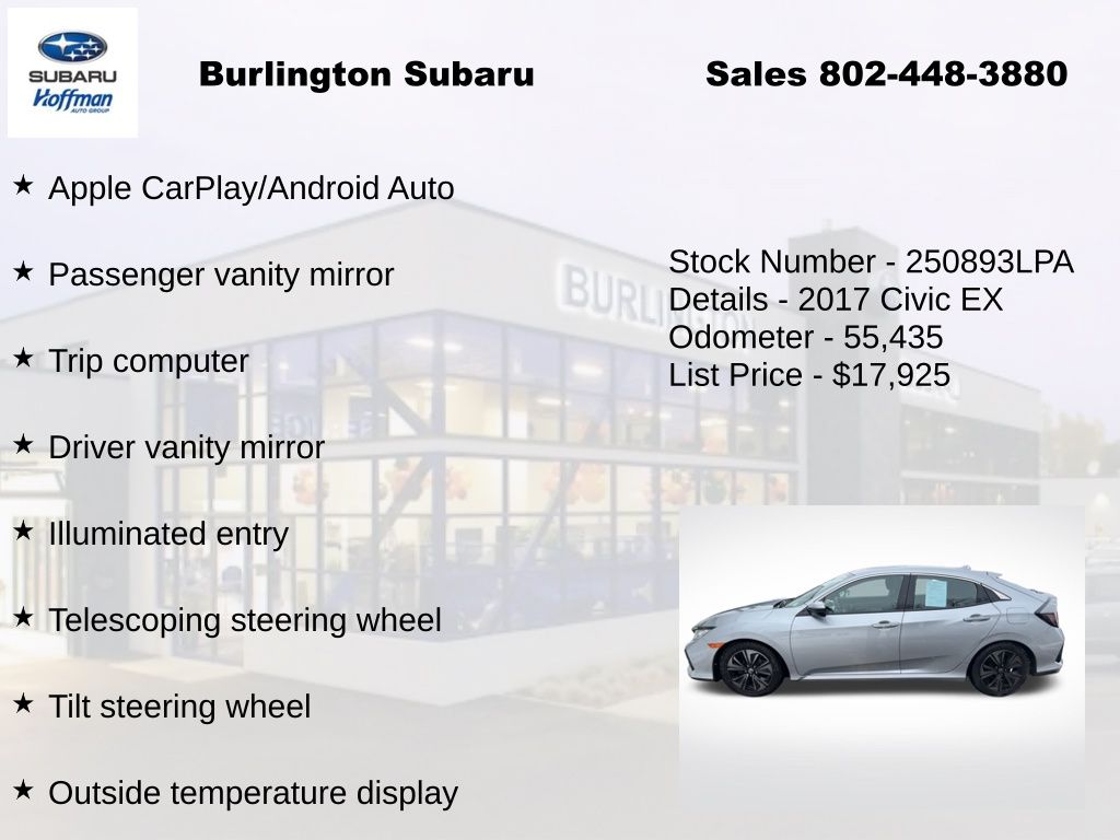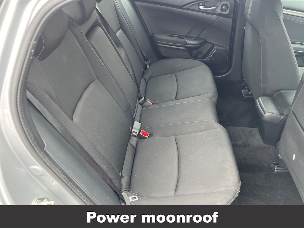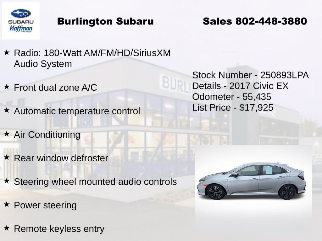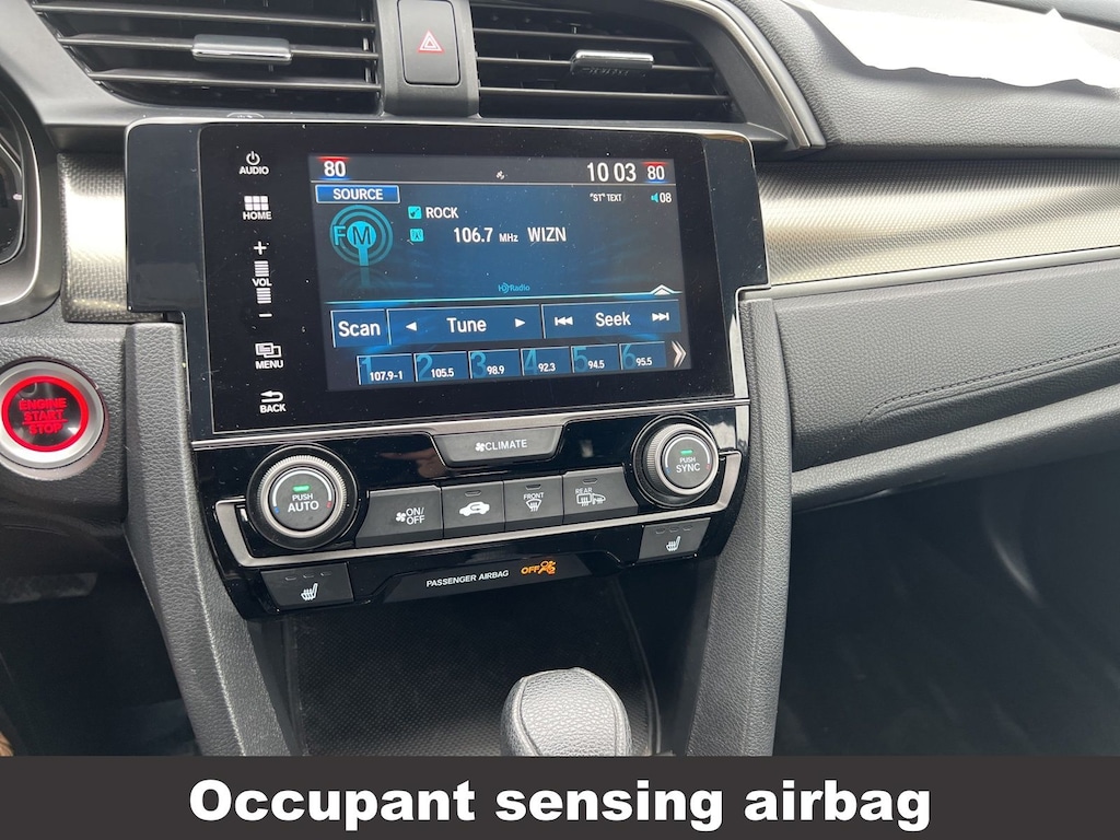 Honda Civic EX 2017 4-Wheel Disc Brakes, ABS brakes, Air Conditioning, Alloy wheels, Apple CarPlay/Android Auto, Automatic temperature control, Brake assist, Delay-off headlights, Driver vanity mirror, Dual front impact airbags, Dual front side impact airbags, Electronic Stability Control, Emergency communication system: HondaLink, Exterior Parking Camera Rear, Four wheel independent suspension, Front dual zone A/C, Front fog lights, Front reading lights, Fully automatic headlights, Heated door mirrors, Illuminated entry, Low tire pressure warning, Occupant sensing airbag, Outside temperature display, Overhead airbag, Panic alarm, Passenger vanity mirror, Power door mirrors, Power moonroof, Power steering, Power windows, Radio: 180-Watt AM/FM/HD/SiriusXM Audio System, Rear window defroster, Rear window wiper, Reclining Front Bucket Seats, Remote keyless entry, Speed control, Speed-sensing steering, Split folding rear seat, Steering wheel mounted audio controls, Tachometer, Telescoping steering wheel, Tilt steering wheel, Traction control, Trip computer, Variably intermittent wipers. Odometer is 57816 miles below market average!