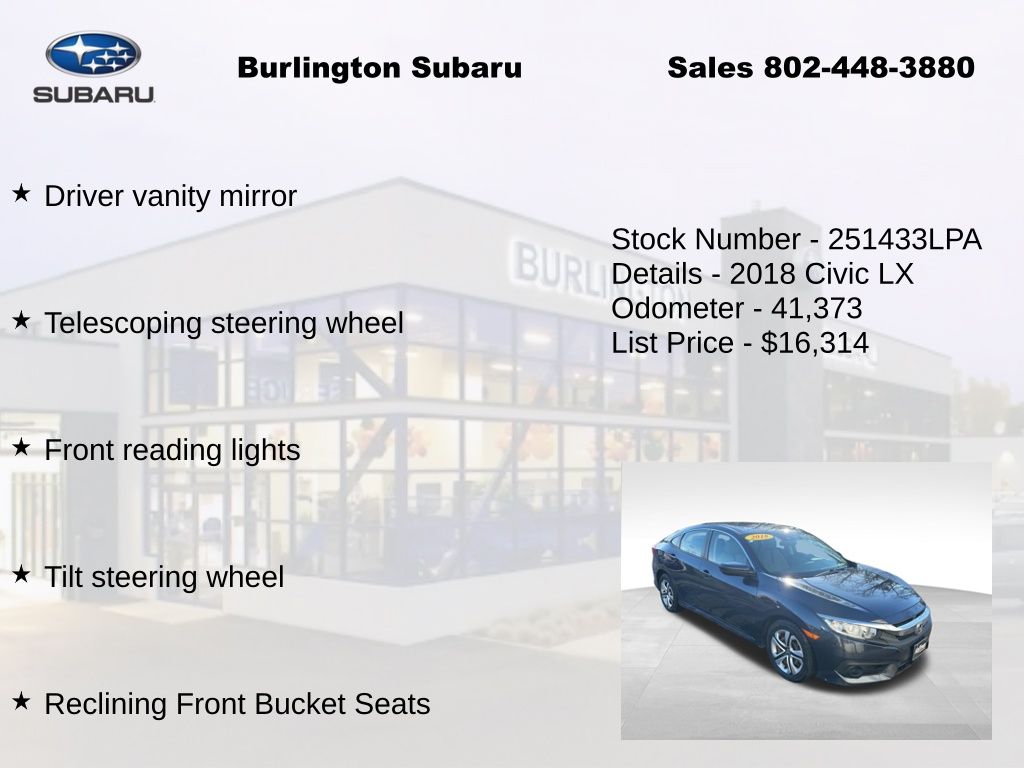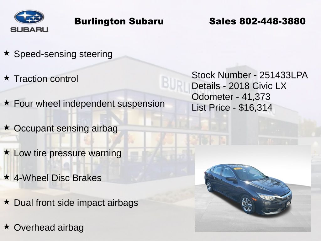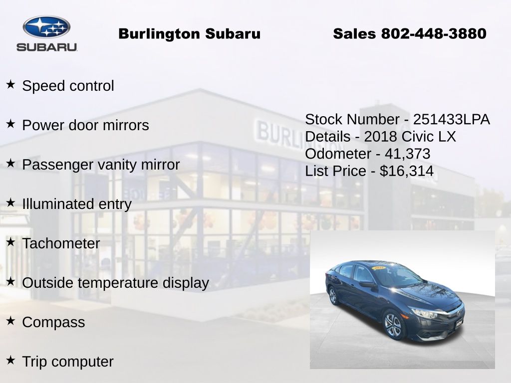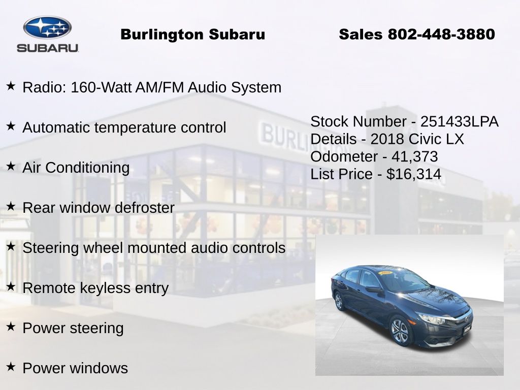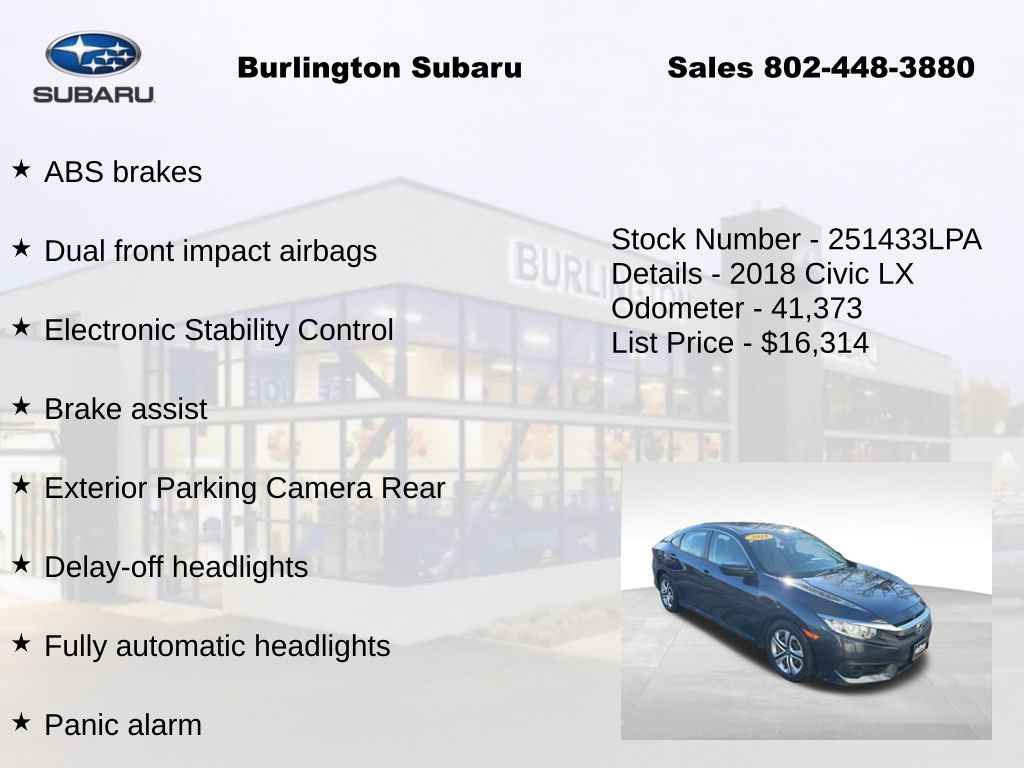 CARFAX One-Owner. Clean CARFAX. Honda Civic LX 2018 4-Wheel Disc Brakes, ABS brakes, Air Conditioning, Automatic temperature control, Brake assist, Compass, Delay-off headlights, Driver vanity mirror, Dual front impact airbags, Dual front side impact airbags, Electronic Stability Control, Exterior Parking Camera Rear, Four wheel independent suspension, Front reading lights, Fully automatic headlights, Illuminated entry, Low tire pressure warning, Occupant sensing airbag, Outside temperature display, Overhead airbag, Panic alarm, Passenger vanity mirror, Power door mirrors, Power steering, Power windows, Radio: 160-Watt AM/FM Audio System, Rear window defroster, Reclining Front Bucket Seats, Remote keyless entry, Speed control, Speed-sensing steering, Steering wheel mounted audio controls, Tachometer, Telescoping steering wheel, Tilt steering wheel, Traction control, Trip computer. Odometer is 62906 miles below market average!