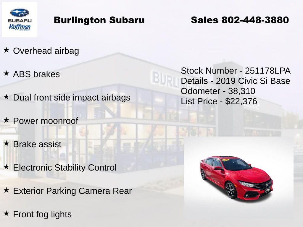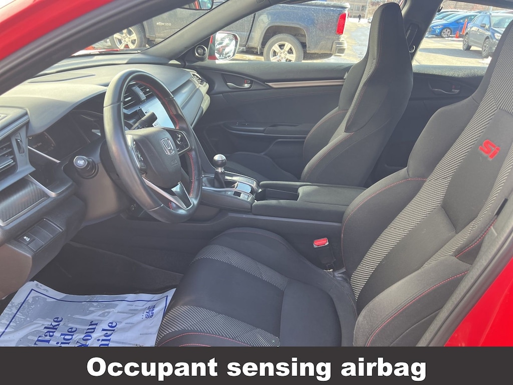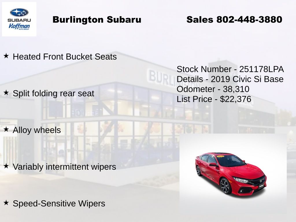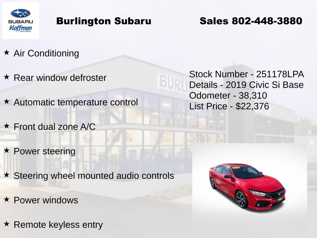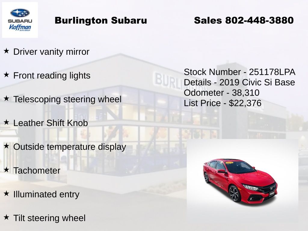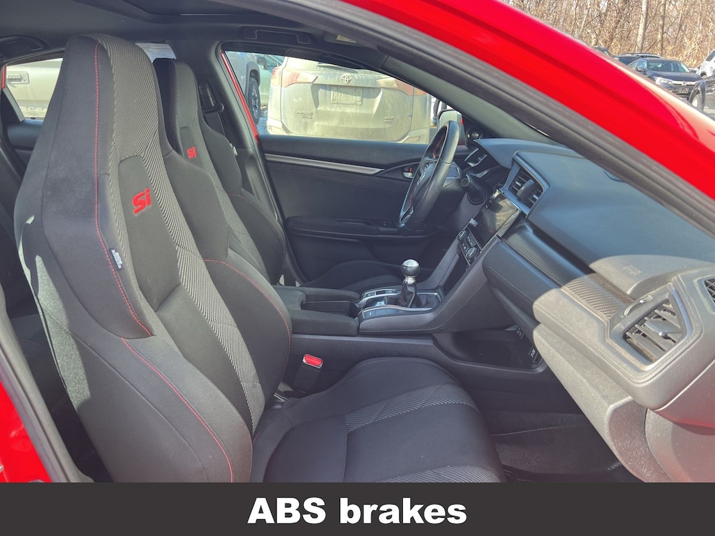 Honda Civic Si 2019 4-Wheel Disc Brakes, ABS brakes, Air Conditioning, Alloy wheels, Automatic temperature control, Brake assist, Delay-off headlights, Driver vanity mirror, Dual front impact airbags, Dual front side impact airbags, Electronic Stability Control, Emergency communication system: HondaLink, Exterior Parking Camera Rear, Four wheel independent suspension, Front dual zone A/C, Front fog lights, Front reading lights, Fully automatic headlights, Heated door mirrors, Heated Front Bucket Seats, Illuminated entry, Leather Shift Knob, Low tire pressure warning, Occupant sensing airbag, Outside temperature display, Overhead airbag, Panic alarm, Passenger vanity mirror, Power door mirrors, Power moonroof, Power steering, Power windows, Rear window defroster, Remote keyless entry, Speed control, Speed-sensing steering, Speed-Sensitive Wipers, Split folding rear seat, Steering wheel mounted audio controls, Tachometer, Telescoping steering wheel, Tilt steering wheel, Traction control, Trip computer, Variably intermittent wipers. Odometer is 40923 miles below market average!