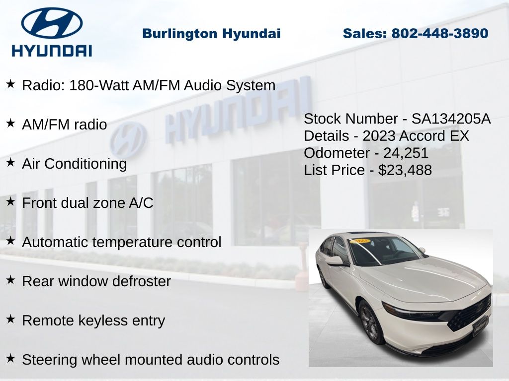 2023 Accord EX 1.5T I4 DOHC 16V Turbocharged VTEC FWD 29/37 City/Highway MPG Priced below KBB Fair Purchase Price! Odometer is 8941 miles below market average! CARFAX One-Owner. Clean CARFAX.