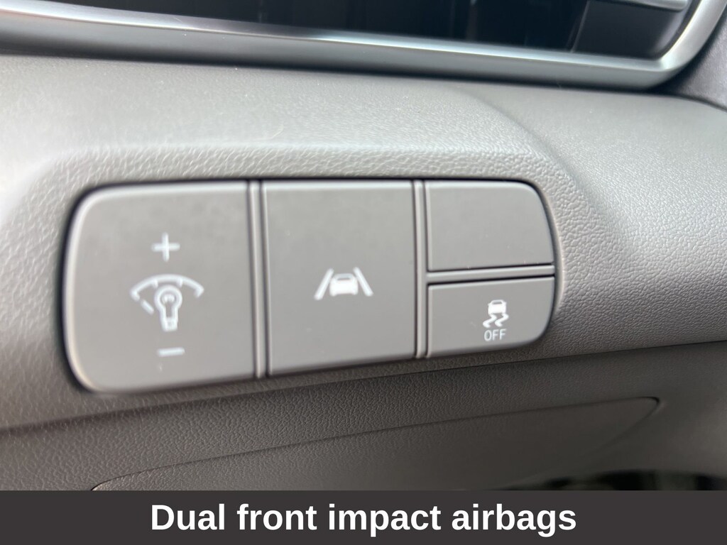 4-Wheel Disc Brakes, ABS brakes, Air Conditioning, Alloy wheels, Apple CarPlay & Android Auto, Auto High-beam Headlights, Automatic temperature control, Brake assist, Delay-off headlights, Driver vanity mirror, Dual front impact airbags, Dual front side impact airbags, Electronic Stability Control, Emergency communication system: Blue Link Connected Car Service (3-year complimentary subscription), Exterior Parking Camera Rear, Front Bucket Seats, Front dual zone A/C, Front reading lights, Front wheel independent suspension, Fully automatic headlights, Illuminated entry, Low tire pressure warning, Occupant sensing airbag, Outside temperature display, Overhead airbag, Panic alarm, Passenger vanity mirror, Power door mirrors, Power steering, Power windows, Radio: AM/FM/HD/SiriusXM Display Audio, Rear window defroster, Remote keyless entry, Speed control, Speed-sensing steering, Steering wheel mounted audio controls, Tachometer, Telescoping steering wheel, Tilt steering wheel, Traction control, Trip computer, Variably intermittent wipers.