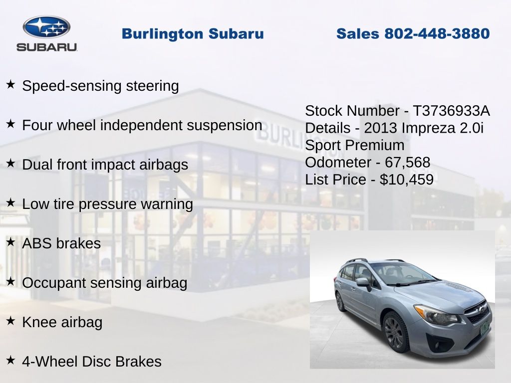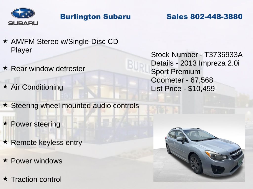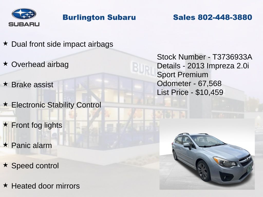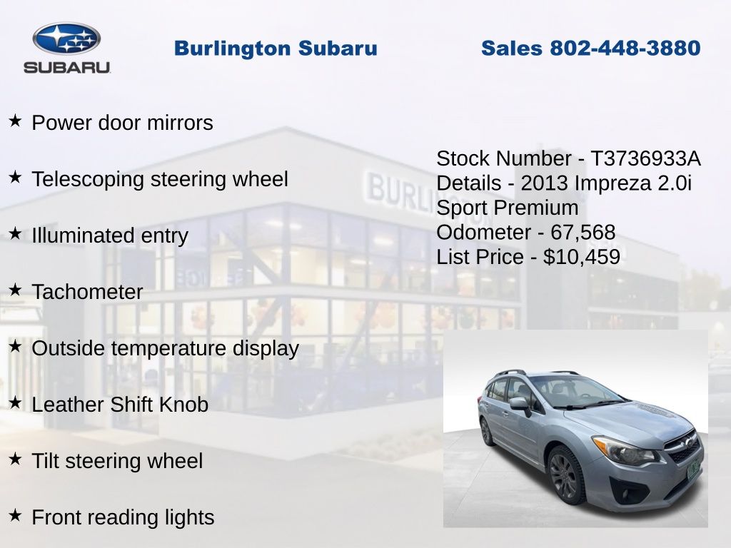 Subaru Impreza 2.0i Sport Premium 2013 4-Wheel Disc Brakes, ABS brakes, Air Conditioning, Alloy wheels, AM/FM Stereo w/Single-Disc CD Player, Brake assist, Driver vanity mirror, Dual front impact airbags, Dual front side impact airbags, Electronic Stability Control, Four wheel independent suspension, Front Bucket Seats, Front fog lights, Front reading lights, Heated door mirrors, Heated Reclining Front Bucket Seats, Illuminated entry, Knee airbag, Leather Shift Knob, Leather steering wheel, Low tire pressure warning, Occupant sensing airbag, Outside temperature display, Overhead airbag, Panic alarm, Passenger vanity mirror, Power door mirrors, Power steering, Power windows, Rear window defroster, Rear window wiper, Remote keyless entry, Speed control, Speed-sensing steering, Split folding rear seat, Steering wheel mounted audio controls, Tachometer, Telescoping steering wheel, Tilt steering wheel, Traction control, Trip computer, Variably intermittent wipers. Odometer is 48333 miles below market average!
