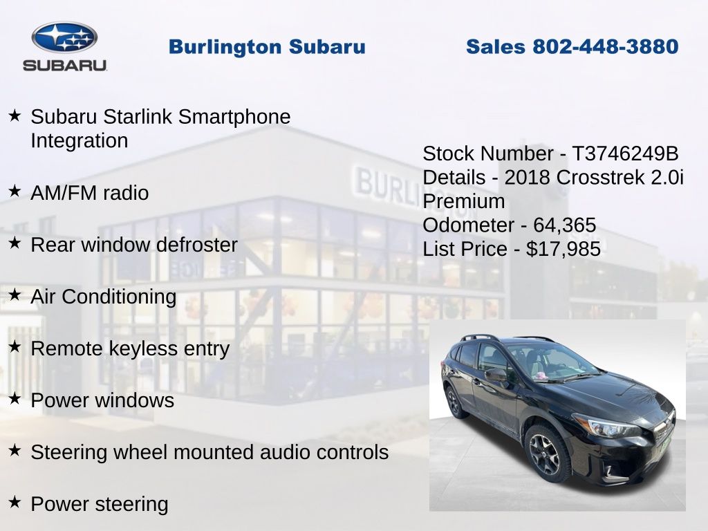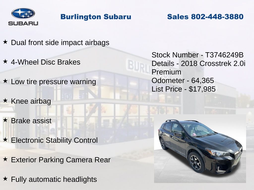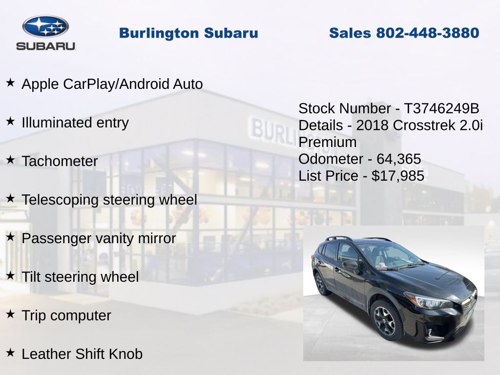 Clean CARFAX. Subaru Crosstrek 2.0i Premium 2018 4-Wheel Disc Brakes, ABS brakes, Air Conditioning, Alloy wheels, AM/FM radio, Apple CarPlay/Android Auto, Auto-Dimming Mirror w/Compass, Brake assist, Driver vanity mirror, Dual front impact airbags, Dual front side impact airbags, Electronic Stability Control, Emergency communication system: STARLINK, Exterior Parking Camera Rear, Four wheel independent suspension, Front fog lights, Front reading lights, Fully automatic headlights, Heated door mirrors, Heated Front Bucket Seats, Heated front seats, Illuminated entry, Knee airbag, Leather Shift Knob, Low tire pressure warning, Map & Dome Lights LED Upgrade, Occupant sensing airbag, Outside temperature display, Overhead airbag, Panic alarm, Passenger vanity mirror, Power door mirrors, Power steering, Power windows, Rear window defroster, Rear window wiper, Remote keyless entry, Speed control, Speed-sensing steering, Split folding rear seat, Steering wheel mounted audio controls, Subaru Starlink Smartphone Integration, Tachometer, Telescoping steering wheel, Tilt steering wheel, Traction control, Trip computer, Variably intermittent wipers. Odometer is 35051 miles below market average!