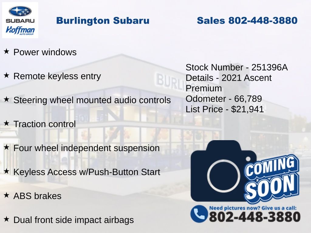 Clean CARFAX. Subaru Ascent Premium 2021 4-Wheel Disc Brakes, ABS brakes, Air Conditioning, Alloy wheels, Auto High-beam Headlights, Auto-Dimming Rear View Compass Mirror w/HomeLink, Automatic temperature control, Brake assist, Delay-off headlights, Driver vanity mirror, Dual front impact airbags, Dual front side impact airbags, Electronic Stability Control, Emergency communication system: STARLINK Safety and Security (Subscription Required), Exterior Parking Camera Rear, Four wheel independent suspension, Front dual zone A/C, Front reading lights, Fully automatic headlights, Heated door mirrors, Heated Front Bucket Seats, Illuminated entry, Keyless Access w/Push-Button Start, Knee airbag, Low tire pressure warning, Occupant sensing airbag, Outside temperature display, Overhead airbag, Overhead console, Panic alarm, Passenger vanity mirror, Power door mirrors, Power driver seat, Power Rear Gate w/Automatic Close & Height Memory, Power steering, Power windows, Radio: Subaru STARLINK 8.0" Multimedia Plus System, Rear air conditioning, Rear reading lights, Rear window defroster, Rear window wiper, Reclining 3rd row seat, Remote keyless entry, Reverse Automatic Braking (RAB) System, Speed control, Spill Resistant Coated Cloth Upholstery, Split folding rear seat, STARLINK/Apple CarPlay/Android Auto, Steering wheel mounted audio controls, Tachometer, Telescoping steering wheel, Tilt steering wheel, Traction control, Trip computer, Variably intermittent wipers. Odometer is 4251 miles below market average!