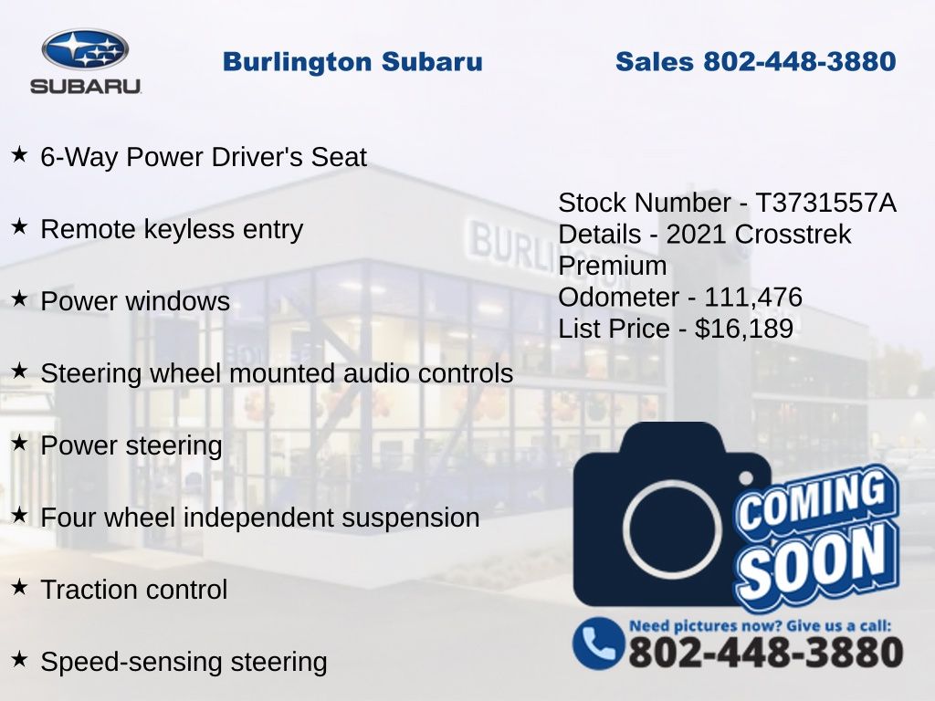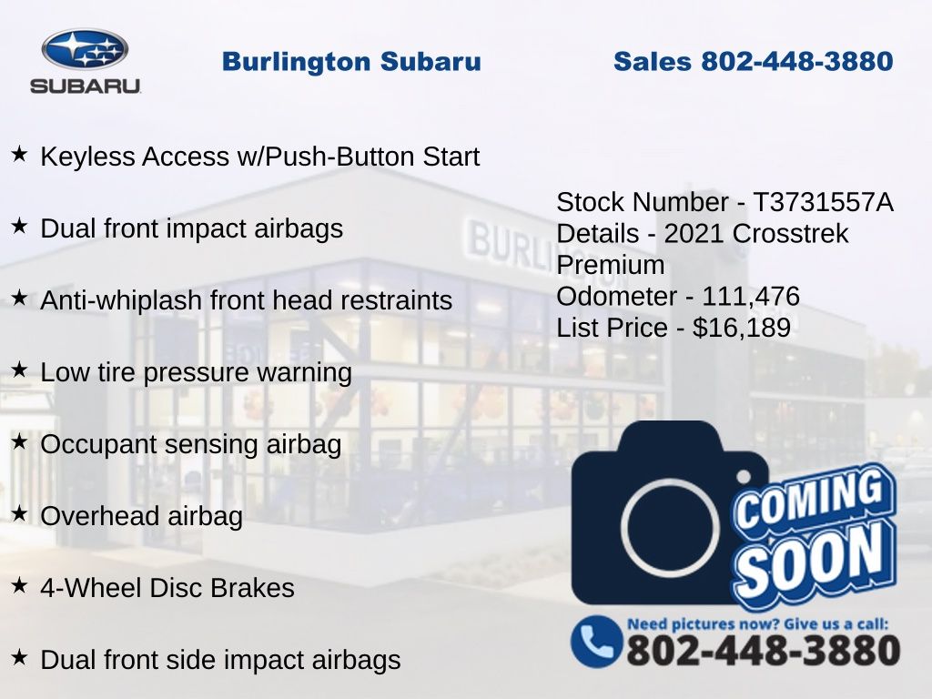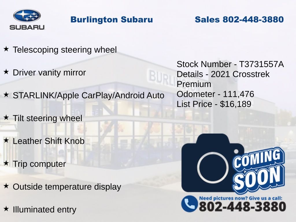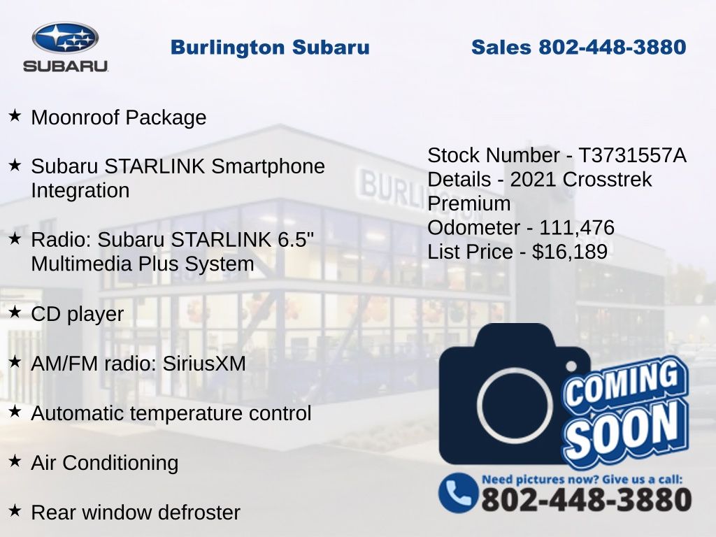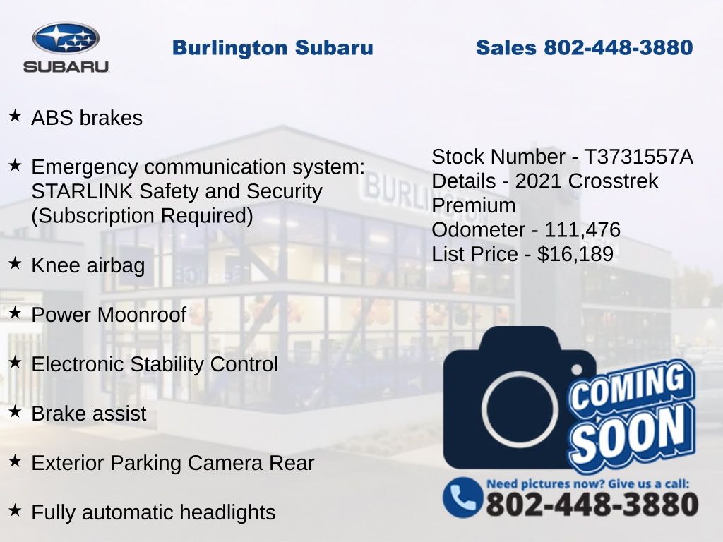 CARFAX One-Owner. Subaru Crosstrek Premium 2021 4-Wheel Disc Brakes, 6-Way Power Driver's Seat, ABS brakes, Air Conditioning, Alloy wheels, AM/FM radio: SiriusXM, Anti-whiplash front head restraints, Automatic temperature control, Blind Spot Detection (BSD), Brake assist, CD player, Driver vanity mirror, Dual front impact airbags, Dual front side impact airbags, Electronic Stability Control, Emergency communication system: STARLINK Safety and Security (Subscription Required), Exterior Parking Camera Rear, EyeSight System, Four wheel independent suspension, Front fog lights, Front reading lights, Fully automatic headlights, Heated door mirrors, Heated Front Bucket Seats, Illuminated entry, Keyless Access w/Push-Button Start, Knee airbag, Leather Shift Knob, Low tire pressure warning, Moonroof Package, Occupant sensing airbag, Outside temperature display, Overhead airbag, Panic alarm, Passenger vanity mirror, Power door mirrors, Power Moonroof, Power steering, Power windows, Radio: Subaru STARLINK 6.5" Multimedia Plus System, Rear window defroster, Rear window wiper, Remote keyless entry, Speed control, Speed-sensing steering, Split folding rear seat, STARLINK/Apple CarPlay/Android Auto, Steering wheel mounted audio controls, Subaru STARLINK Smartphone Integration, Tachometer, Telescoping steering wheel, Tilt steering wheel, Traction control, Trip computer, Variably intermittent wipers.