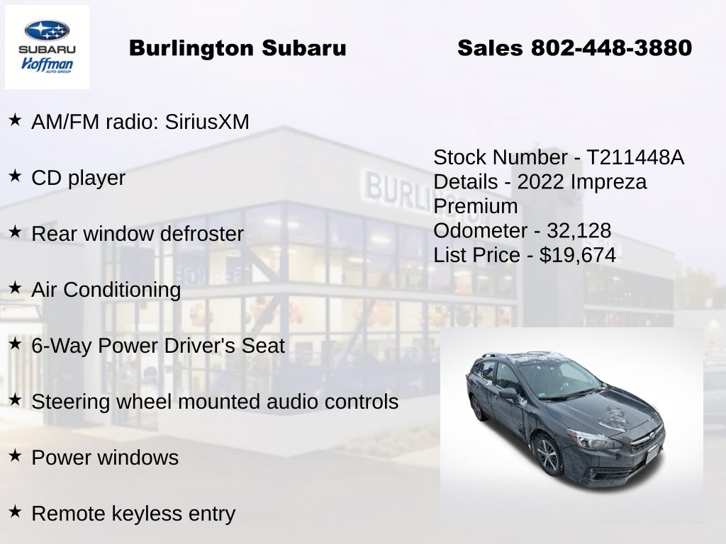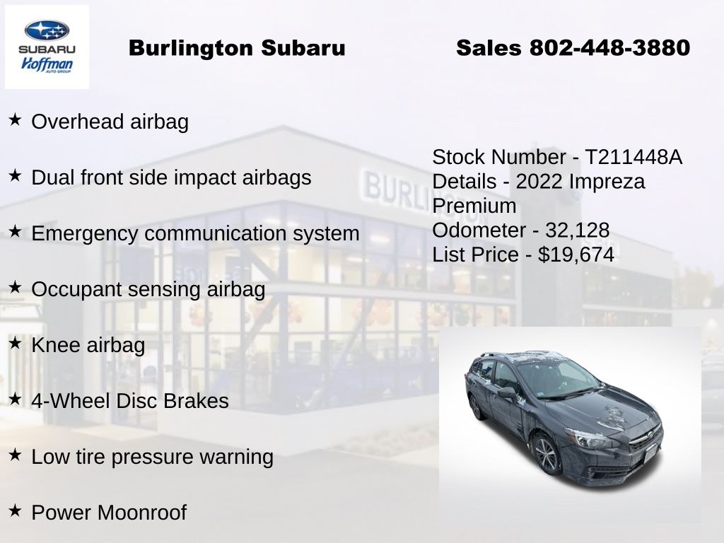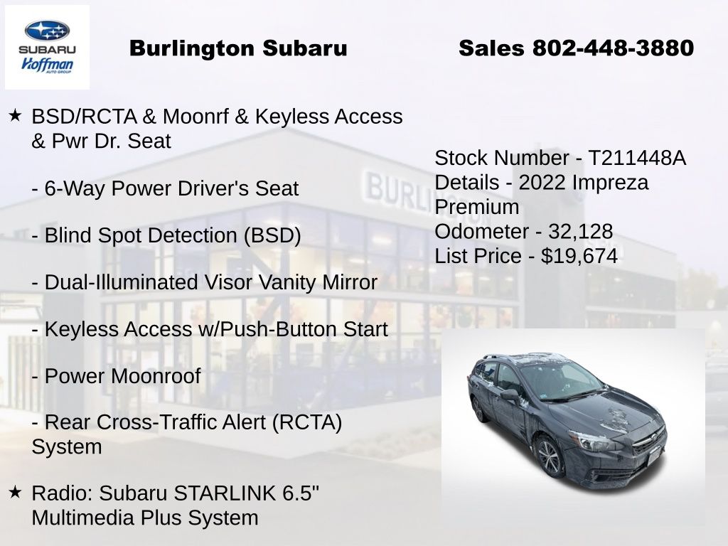 CARFAX One-Owner. Subaru Impreza Premium 2022 4-Wheel Disc Brakes, 6-Way Power Driver's Seat, ABS brakes, Air Conditioning, Alloy wheels, AM/FM radio: SiriusXM, Anti-whiplash front head restraints, Blind Spot Detection (BSD), Brake assist, BSD/RCTA & Moonrf & Keyless Access & Pwr Dr. Seat, CD player, Delay-off headlights, Driver vanity mirror, Dual front impact airbags, Dual front side impact airbags, Dual-Illuminated Visor Vanity Mirror, Electronic Stability Control, Emergency communication system, Exterior Parking Camera Rear, Four wheel independent suspension, Front fog lights, Front reading lights, Fully automatic headlights, Heated door mirrors, Heated Front Bucket Seats, Illuminated entry, Keyless Access w/Push-Button Start, Knee airbag, Low tire pressure warning, Occupant sensing airbag, Outside temperature display, Overhead airbag, Panic alarm, Passenger vanity mirror, Power door mirrors, Power Moonroof, Power steering, Power windows, Radio: Subaru STARLINK 6.5" Multimedia Plus System, Rear Cross-Traffic Alert (RCTA) System, Rear window defroster, Rear window wiper, Remote keyless entry, Speed control, Speed-sensing steering, Split folding rear seat, STARLINK/Apple CarPlay/Android Auto, Steering wheel mounted audio controls, Tachometer, Telescoping steering wheel, Tilt steering wheel, Traction control, Trip computer, Variably intermittent wipers. Odometer is 7979 miles below market average!