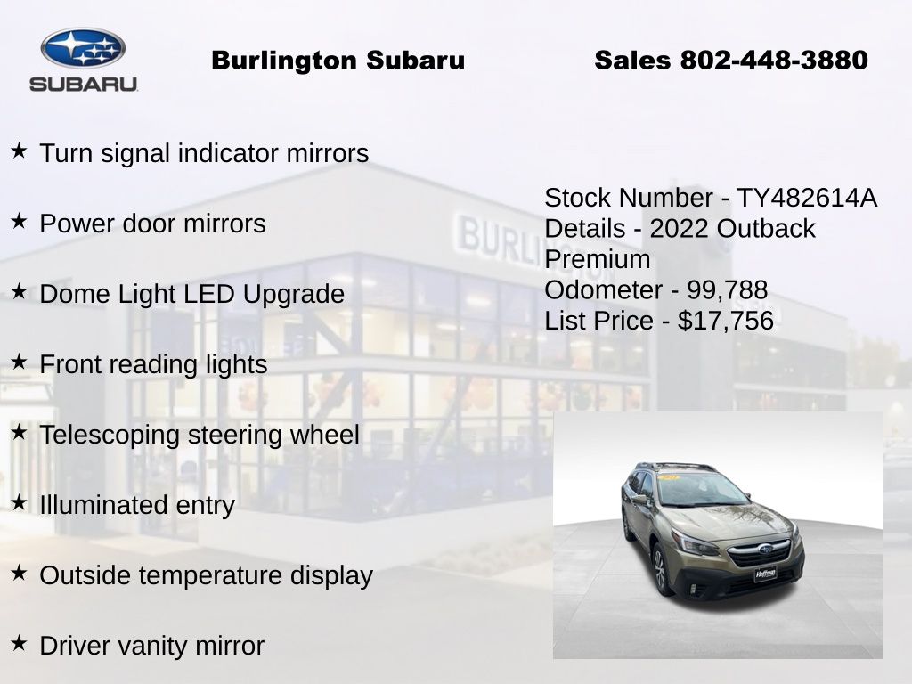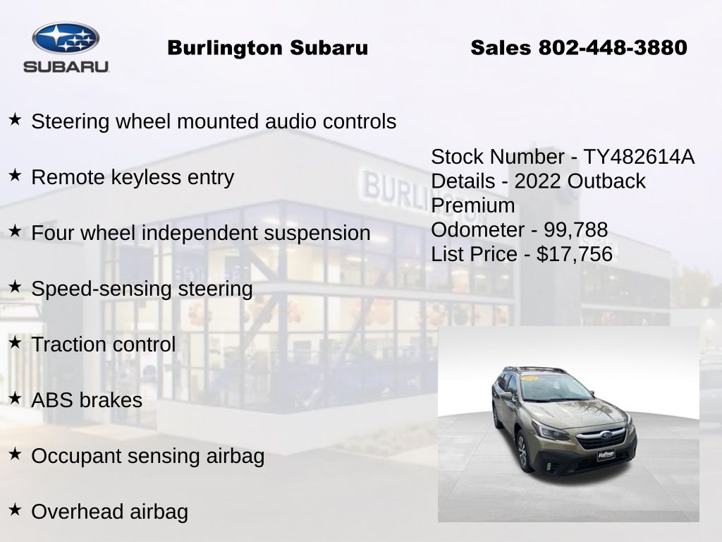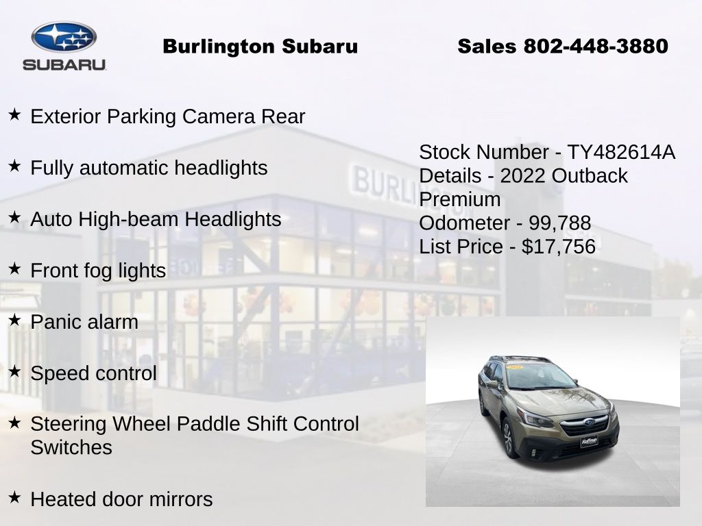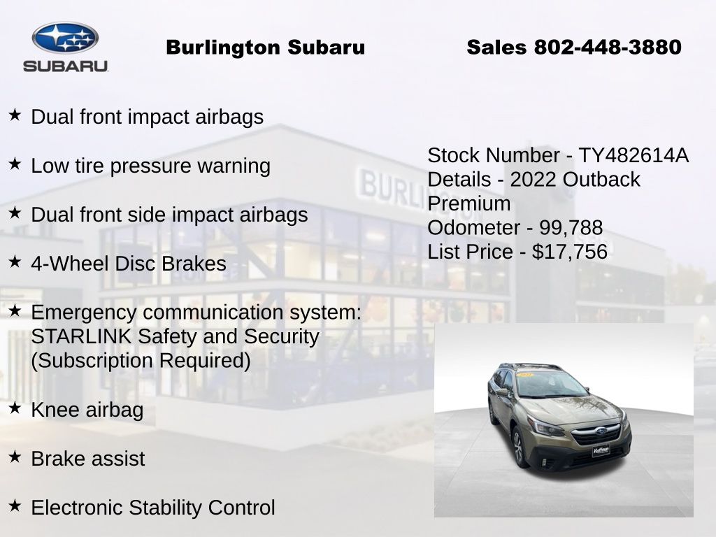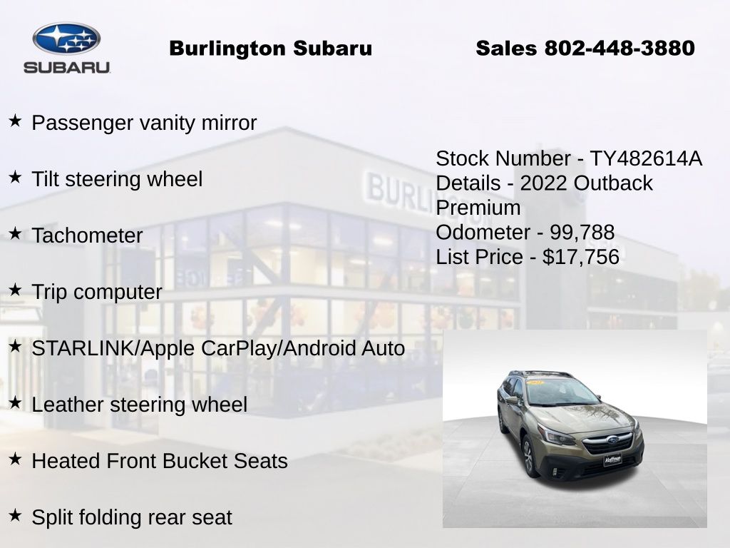 CARFAX One-Owner. Subaru Outback Premium 2022 4-Wheel Disc Brakes, ABS brakes, Air Conditioning, Alloy wheels, AM/FM radio: SiriusXM, Auto High-beam Headlights, Automatic temperature control, Brake assist, Dome Light LED Upgrade, Driver vanity mirror, Dual front impact airbags, Dual front side impact airbags, Electronic Stability Control, Emergency communication system: STARLINK Safety and Security (Subscription Required), Exterior Parking Camera Rear, Four wheel independent suspension, Front dual zone A/C, Front fog lights, Front reading lights, Fully automatic headlights, Heated door mirrors, Heated Front Bucket Seats, Illuminated entry, Knee airbag, Leather steering wheel, Low tire pressure warning, Occupant sensing airbag, Outside temperature display, Overhead airbag, Panic alarm, Passenger vanity mirror, Power door mirrors, Power driver seat, Power steering, Power windows, Rear window defroster, Rear window wiper, Remote keyless entry, Speed control, Speed-sensing steering, Split folding rear seat, STARLINK/Apple CarPlay/Android Auto, Steering wheel mounted audio controls, Steering Wheel Paddle Shift Control Switches, Tachometer, Telescoping steering wheel, Tilt steering wheel, Traction control, Trip computer, Turn signal indicator mirrors, Variably intermittent wipers.
