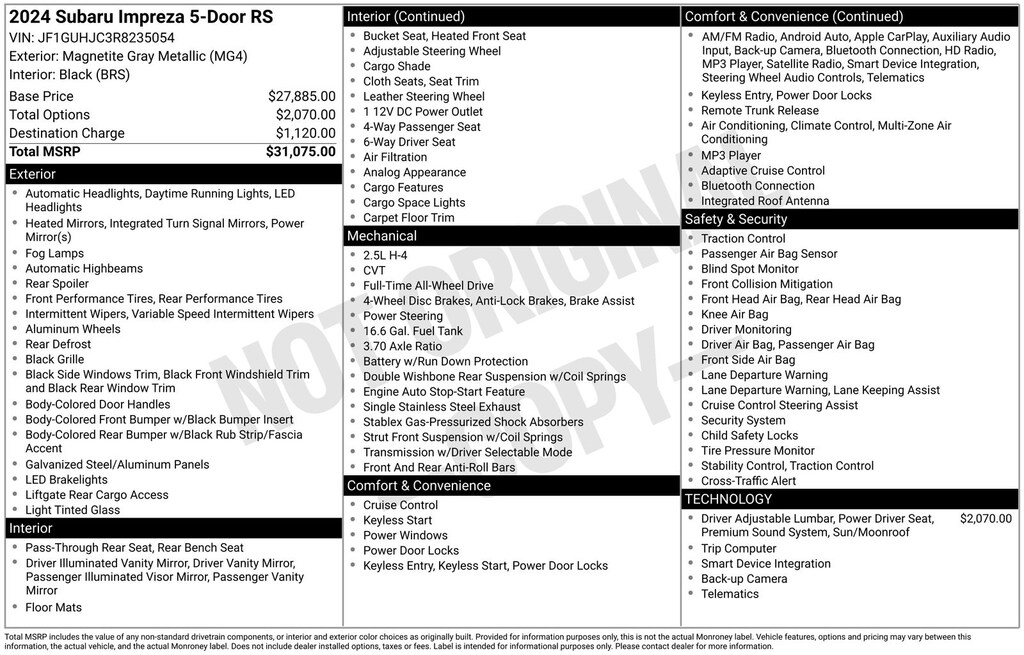 CARFAX One-Owner. Subaru Impreza 2.5RS 2024 10-Way Power Driver's Seat, 4-Wheel Disc Brakes, ABS brakes, Air Conditioning, Alloy wheels, Anti-whiplash front head restraints, Auto High-beam Headlights, Automatic temperature control, Brake assist, Driver vanity mirror, Dual front impact airbags, Dual front side impact airbags, Electronic Stability Control, Emergency communication system: STARLINK Safety and Security (Subscription Required), Exterior Parking Camera Rear, Four wheel independent suspension, Front dual zone A/C, Front fog lights, Front reading lights, Fully automatic headlights, H/K Audio & Power Moonroof & Power Driver Seat, harman/kardon Speaker System, Heated door mirrors, Heated Front Bucket Seats, Illuminated entry, Knee airbag, Leather Shift Knob, Low tire pressure warning, Occupant sensing airbag, Outside temperature display, Overhead airbag, Panic alarm, Passenger vanity mirror, Power door mirrors, Power Moonroof, Power steering, Power windows, Rear window defroster, Rear window wiper, Remote keyless entry, Speed control, Speed-sensing steering, Split folding rear seat, STARLINK/Apple CarPlay/Android Auto, Steering wheel mounted audio controls, Tachometer, Telescoping steering wheel, Tilt steering wheel, Traction control, Trip computer, Turn signal indicator mirrors, Variably intermittent wipers.