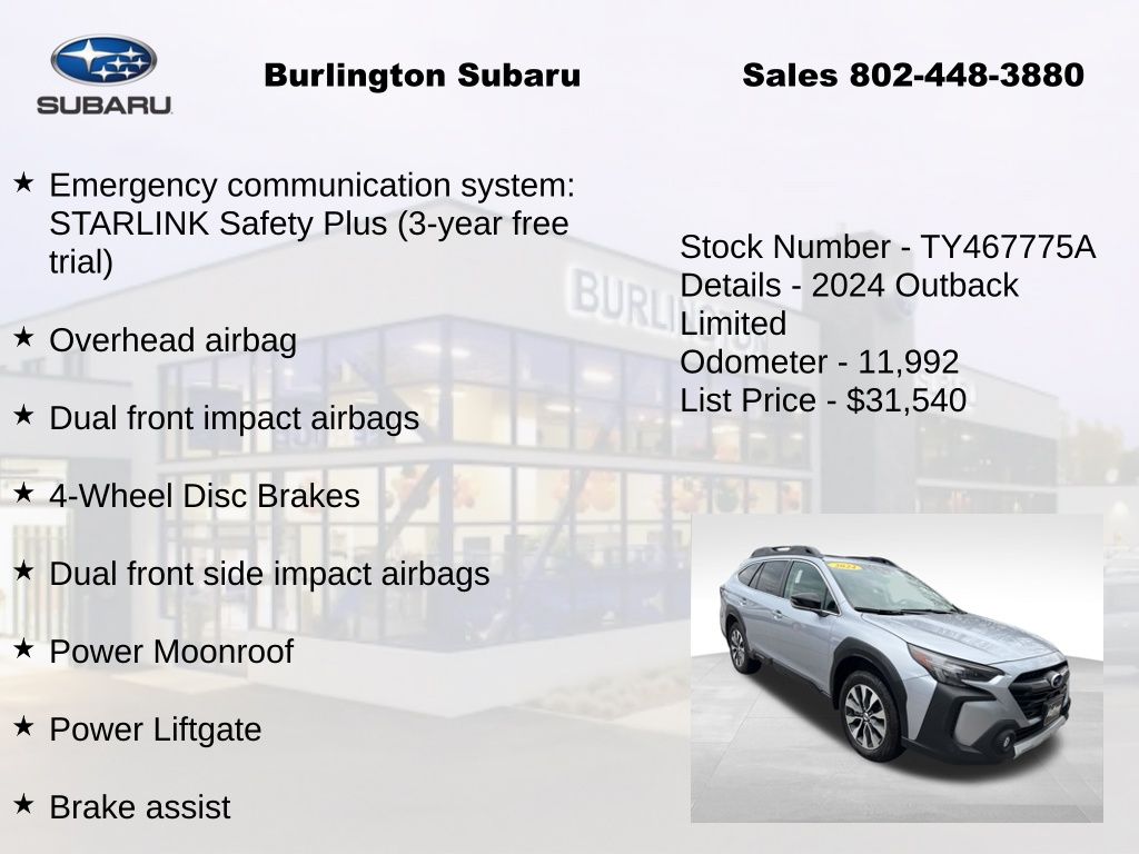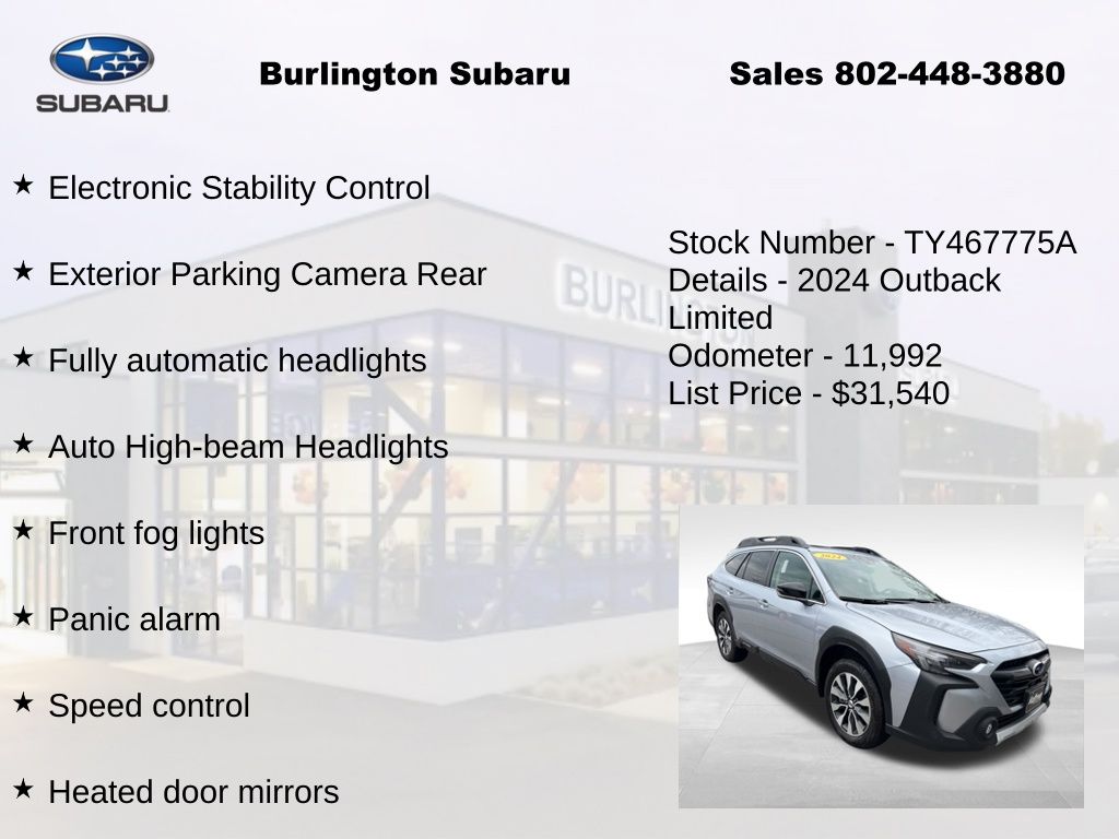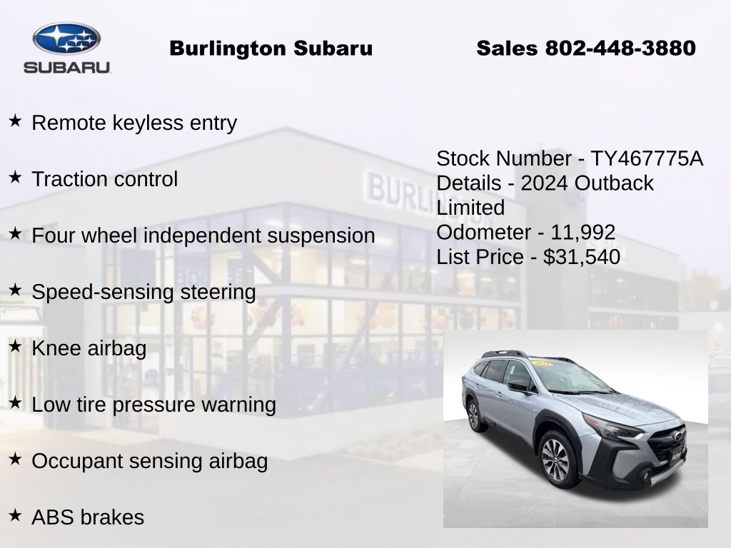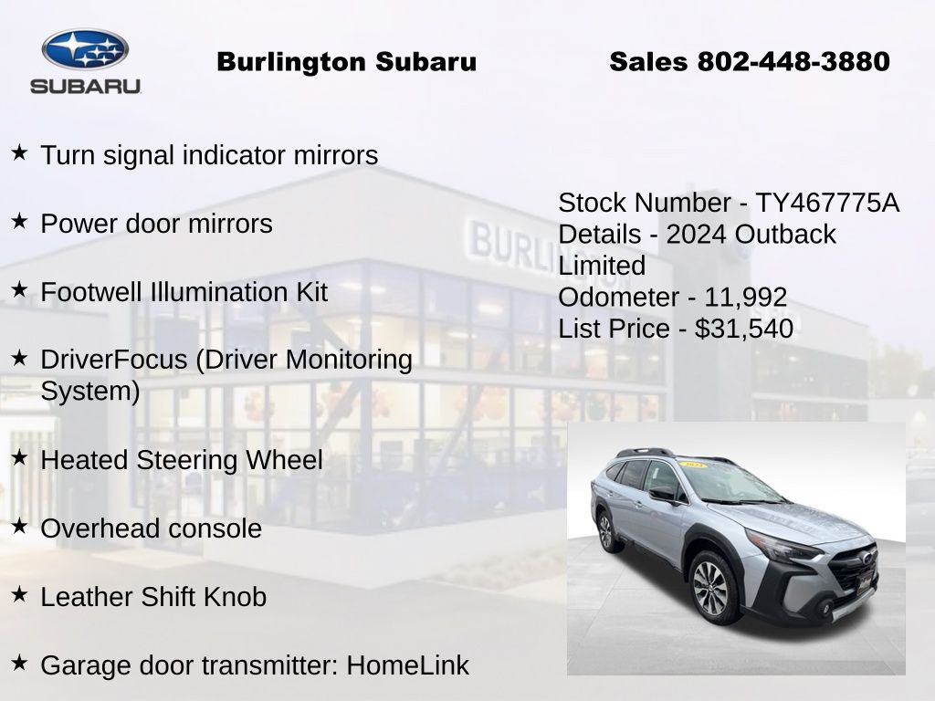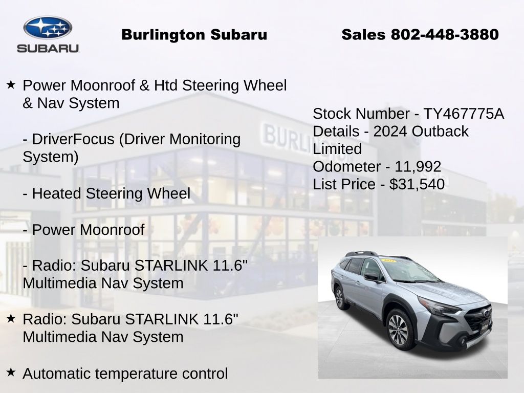 CARFAX One-Owner. Clean CARFAX. Subaru Outback Limited 2024 New Price! 4-Wheel Disc Brakes, ABS brakes, Air Conditioning, Alloy wheels, Auto High-beam Headlights, Auto-dimming Rear-View mirror, Automatic temperature control, Brake assist, Compass, Driver vanity mirror, DriverFocus (Driver Monitoring System), Dual front impact airbags, Dual front side impact airbags, Electronic Stability Control, Emergency communication system: STARLINK Safety Plus (3-year free trial), Exterior Parking Camera Rear, Footwell Illumination Kit, Four wheel independent suspension, Front dual zone A/C, Front fog lights, Front reading lights, Fully automatic headlights, Garage door transmitter: HomeLink, Heated door mirrors, Heated Front Bucket Seats, Heated Steering Wheel, Illuminated entry, Knee airbag, Leather Shift Knob, Leather steering wheel, Low tire pressure warning, Memory seat, Occupant sensing airbag, Outside temperature display, Overhead airbag, Overhead console, Panic alarm, Passenger vanity mirror, Perforated Leather-Trimmed Upholstery, Power door mirrors, Power driver seat, Power Liftgate, Power Moonroof, Power Moonroof & Htd Steering Wheel & Nav System, Power passenger seat, Power steering, Power windows, Radio: Subaru STARLINK 11.6" Multimedia Nav System, Rear window defroster, Rear window wiper, Remote keyless entry, Speed control, Speed-sensing steering, Split folding rear seat, Steering wheel mounted audio controls, Tachometer, Telescoping steering wheel, Tilt steering wheel, Traction control, Trailer Hitch, Trip computer, Turn signal indicator mirrors, Variably intermittent wipers. Odometer is 17375 miles below market average!