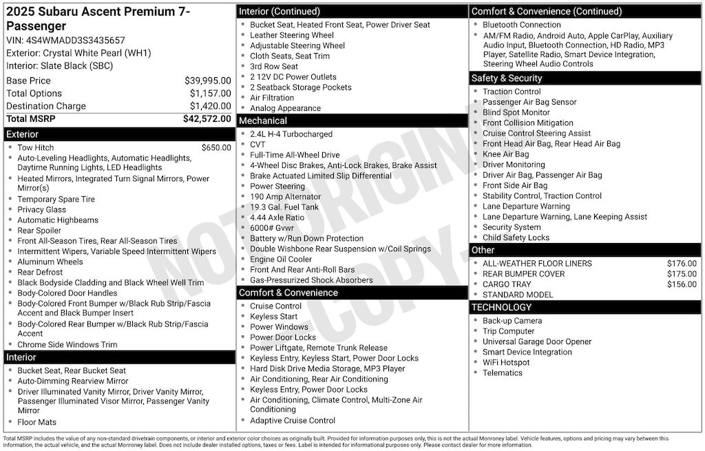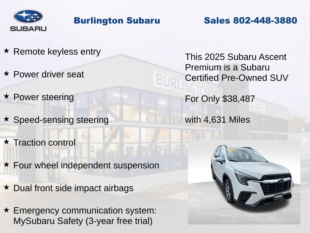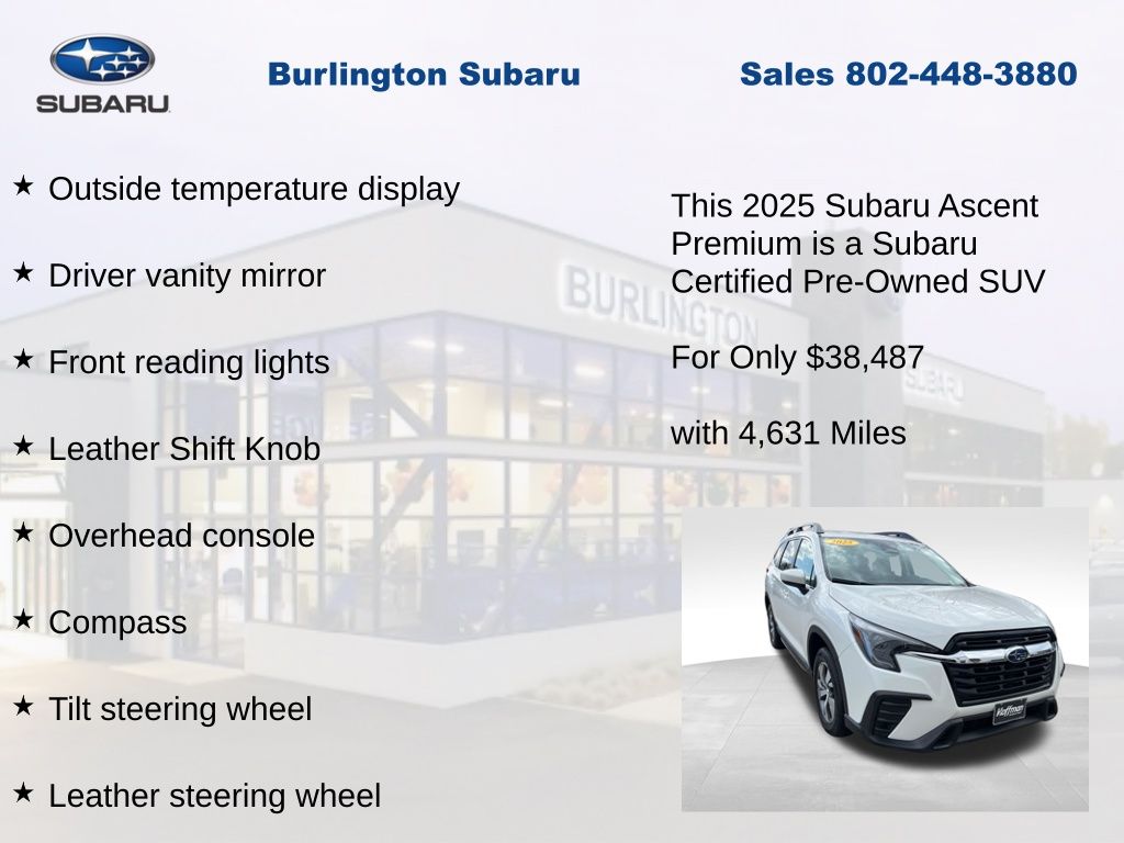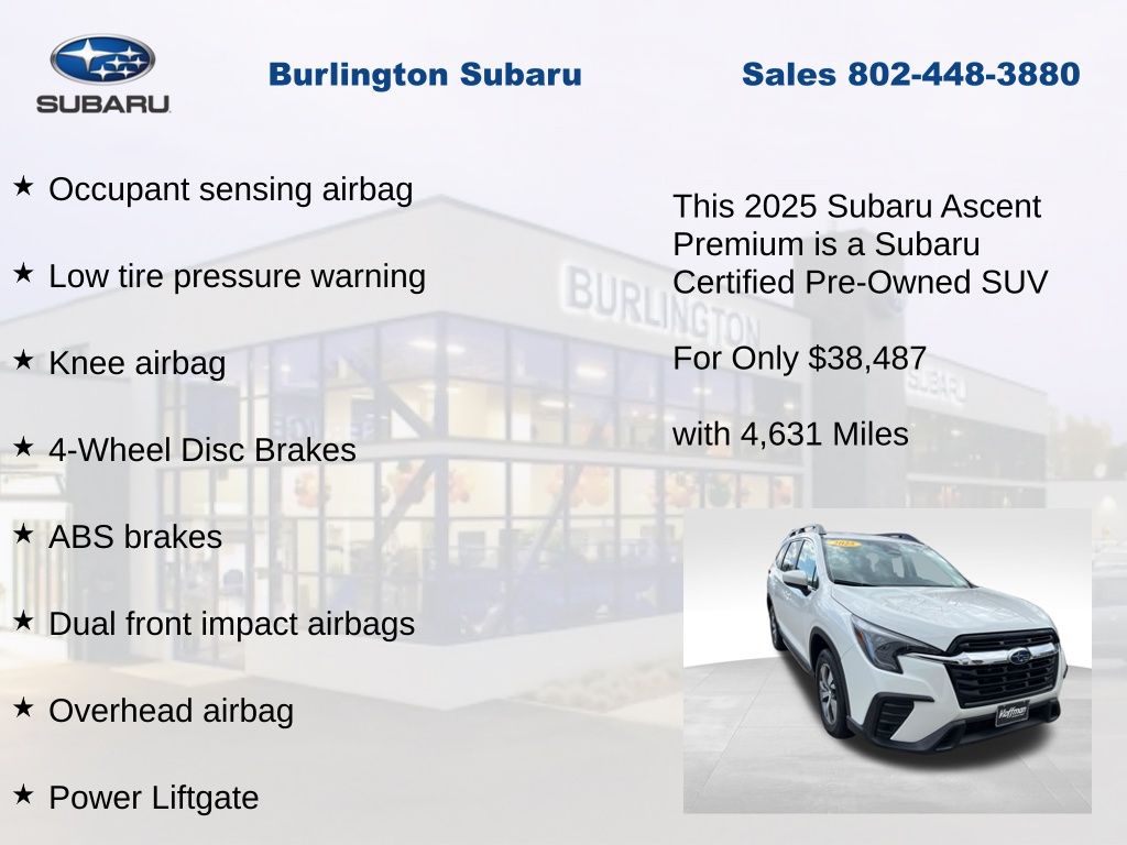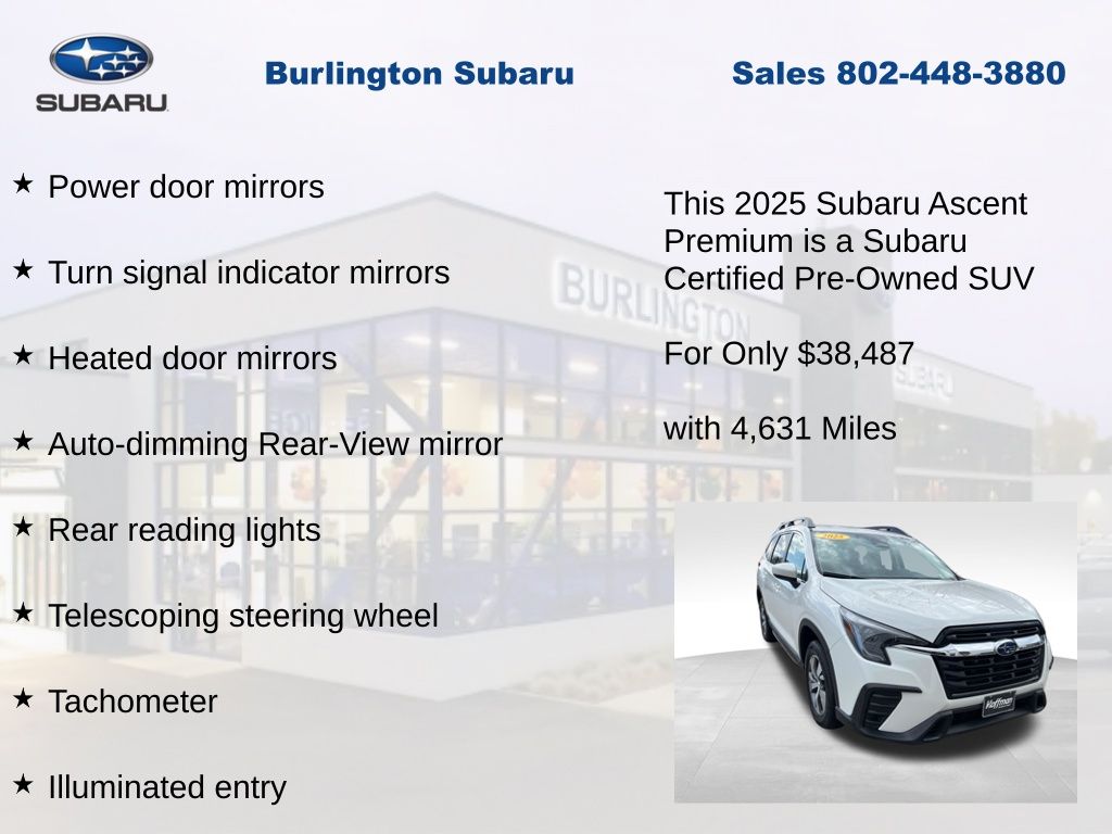 Clean CARFAX. Subaru Ascent Premium 2025 Certified. 3rd row seats: bench, 4-Wheel Disc Brakes, ABS brakes, Air Conditioning, Alloy wheels, AM/FM radio: SiriusXM with 360L, Apple CarPlay & Android Auto, Auto High-beam Headlights, Auto-dimming Rear-View mirror, Automatic temperature control, Brake assist, Compass, Delay-off headlights, Driver vanity mirror, Dual front impact airbags, Dual front side impact airbags, Electronic Stability Control, Emergency communication system: MySubaru Safety (3-year free trial), Exterior Parking Camera Rear, Four wheel independent suspension, Front dual zone A/C, Front reading lights, Fully automatic headlights, Garage door transmitter: HomeLink, Heated door mirrors, Heated Front Bucket Seats, Illuminated entry, Knee airbag, Leather Shift Knob, Leather steering wheel, Low tire pressure warning, Occupant sensing airbag, Outside temperature display, Overhead airbag, Overhead console, Panic alarm, Passenger vanity mirror, Power door mirrors, Power driver seat, Power Liftgate, Power steering, Power windows, Rear air conditioning, Rear reading lights, Rear window defroster, Rear window wiper, Reclining 3rd row seat, Remote keyless entry, Speed control, Speed-sensing steering, Split folding rear seat, Steering wheel mounted audio controls, Tachometer, Telescoping steering wheel, Tilt steering wheel, Traction control, Trip computer, Turn signal indicator mirrors, Variably intermittent wipers. Odometer is 1742 miles below market average!