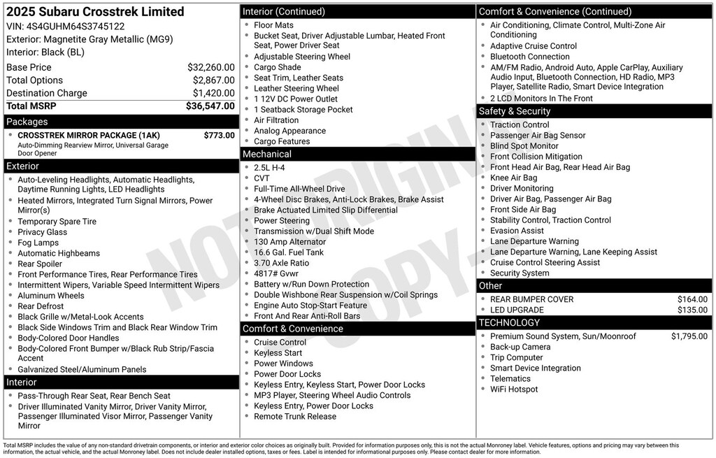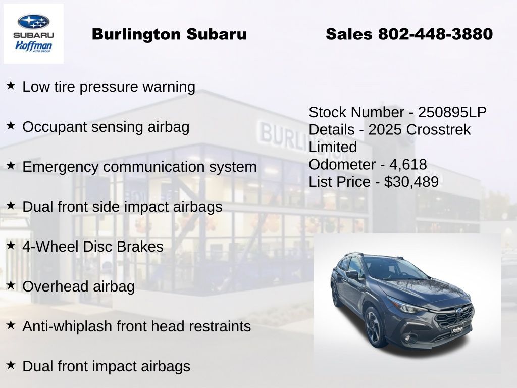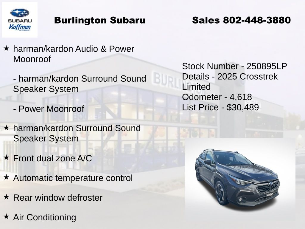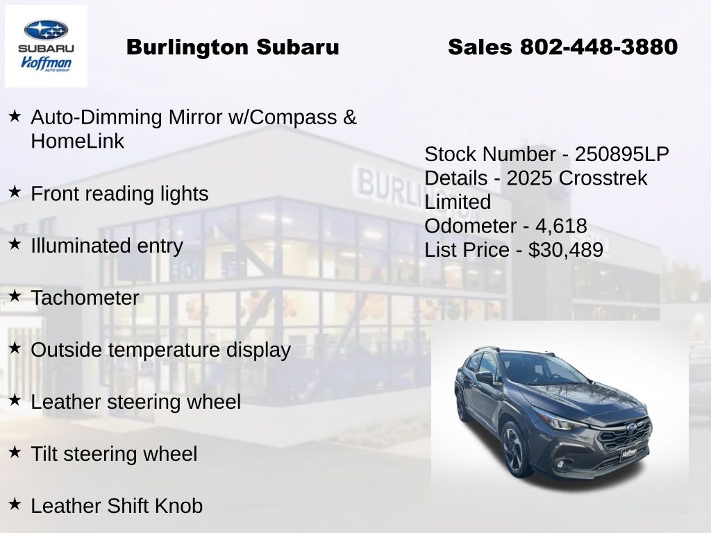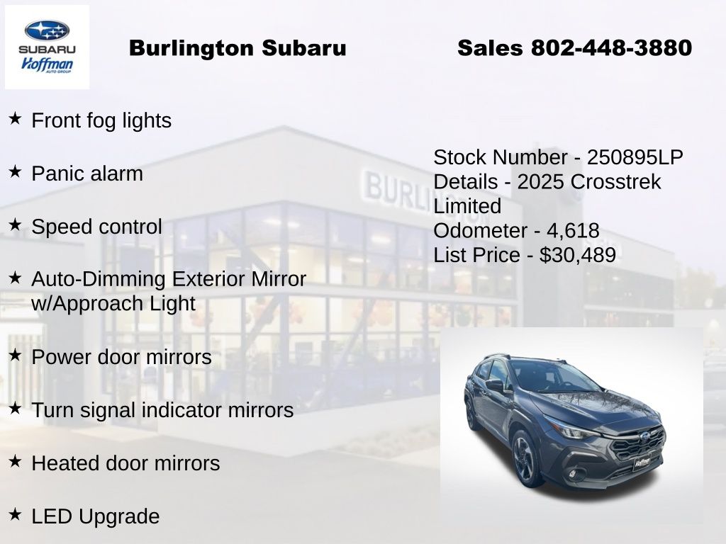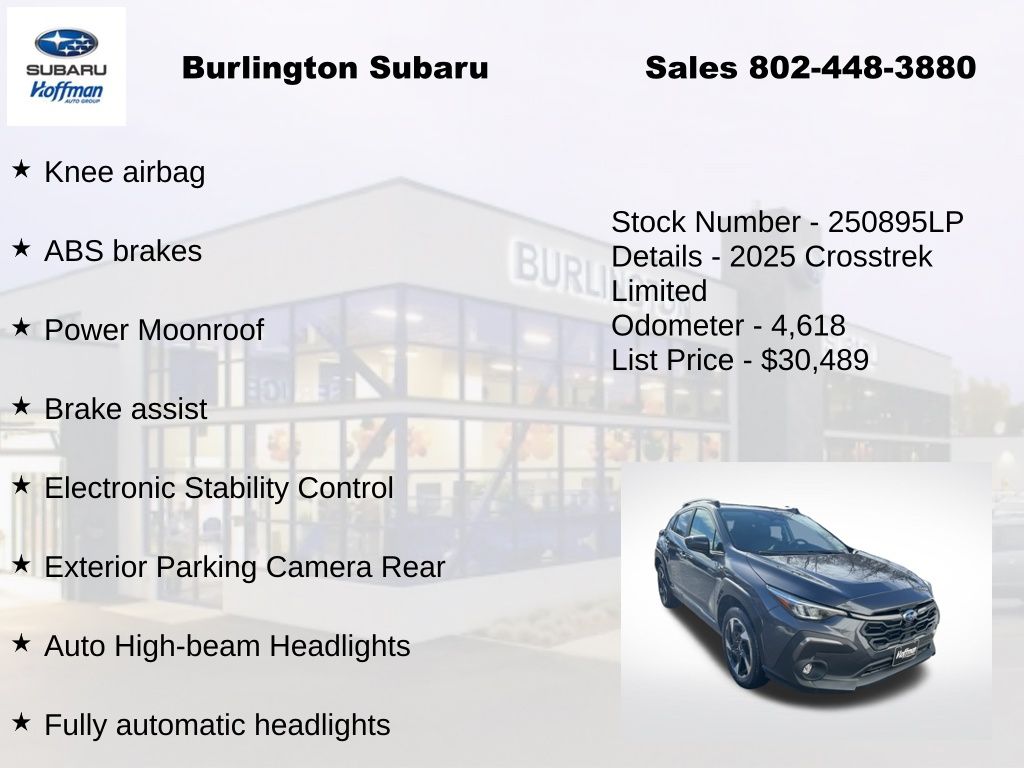 CARFAX One-Owner. Clean CARFAX. Subaru Crosstrek Limited 2025 4-Wheel Disc Brakes, ABS brakes, Air Conditioning, Alloy wheels, Anti-whiplash front head restraints, Auto High-beam Headlights, Auto-Dimming Exterior Mirror w/Approach Light, Auto-Dimming Mirror w/Compass & HomeLink, Automatic temperature control, Brake assist, Driver vanity mirror, Dual front impact airbags, Dual front side impact airbags, Electronic Stability Control, Emergency communication system, Exterior Parking Camera Rear, Four wheel independent suspension, Front dual zone A/C, Front fog lights, Front reading lights, Fully automatic headlights, harman/kardon Audio & Power Moonroof, harman/kardon Surround Sound Speaker System, Heated door mirrors, Heated Front Bucket Seats, Illuminated entry, Knee airbag, Leather Shift Knob, Leather steering wheel, Leather-Trimmed Upholstery, LED Upgrade, Low tire pressure warning, Occupant sensing airbag, Outside temperature display, Overhead airbag, Panic alarm, Passenger vanity mirror, Power door mirrors, Power driver seat, Power Moonroof, Power steering, Power windows, Rear window defroster, Rear window wiper, Remote keyless entry, Speed control, Speed-sensing steering, Split folding rear seat, Steering wheel mounted audio controls, Tachometer, Telescoping steering wheel, Tilt steering wheel, Traction control, Trip computer, Turn signal indicator mirrors, Variably intermittent wipers.