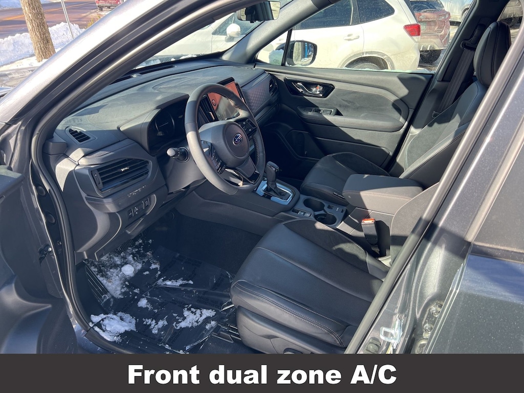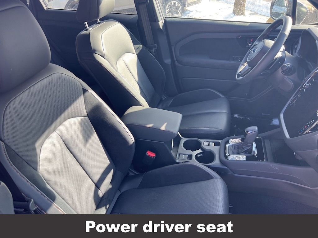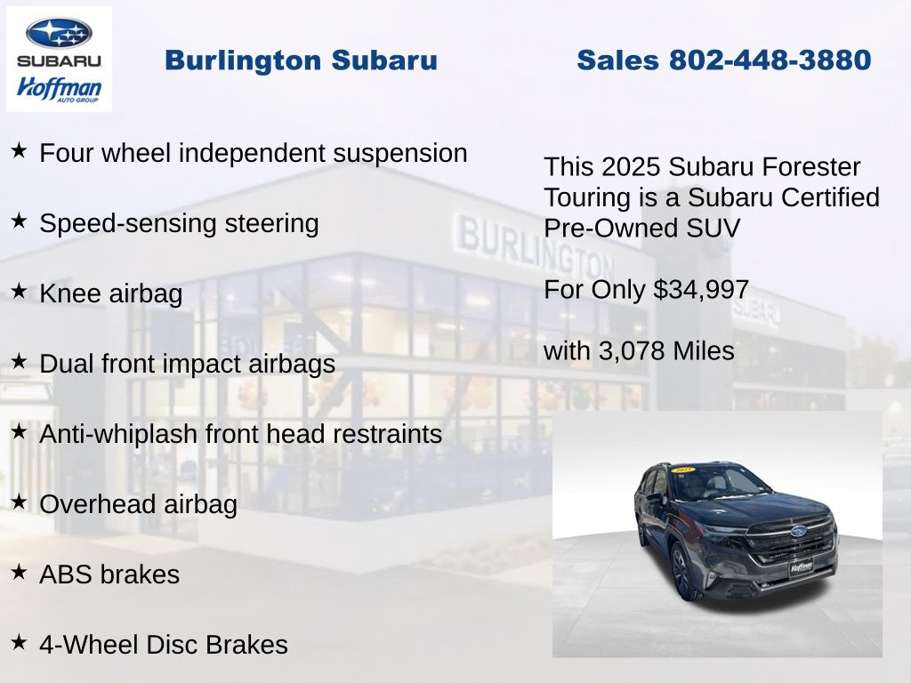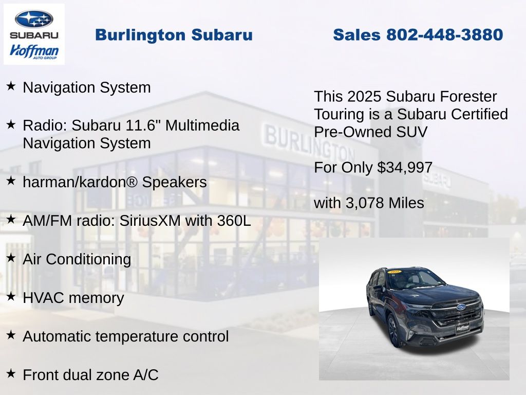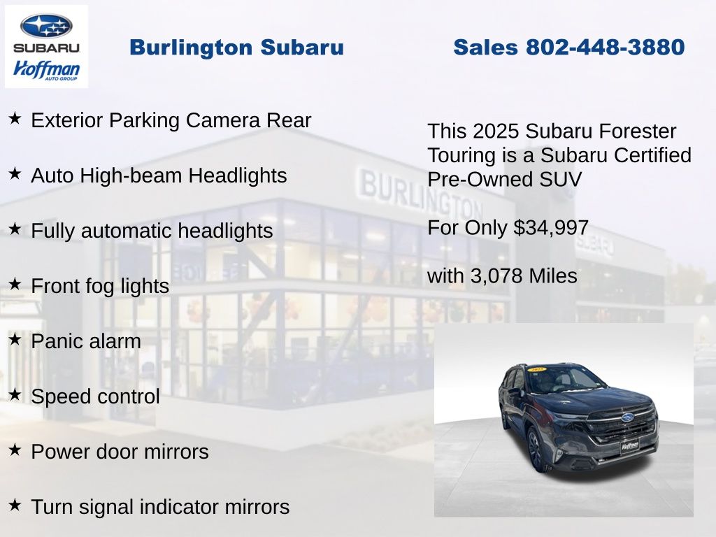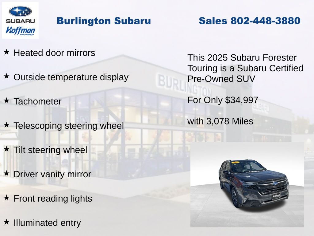 Clean CARFAX. Subaru Forester Touring 2025 Certified. 4-Wheel Disc Brakes, ABS brakes, Air Conditioning, Alloy wheels, AM/FM radio: SiriusXM with 360L, Anti-whiplash front head restraints, Auto High-beam Headlights, Automatic temperature control, Brake assist, Driver vanity mirror, Dual front impact airbags, Dual front side impact airbags, Electronic Stability Control, Emergency communication system: MySubaru Safety (3-year free trial), Exterior Parking Camera Rear, Four wheel independent suspension, Front dual zone A/C, Front fog lights, Front reading lights, Fully automatic headlights, harman/kardon® Speakers, Heated & Ventilated Front Bucket Seats, Heated door mirrors, Heated rear seats, Heated steering wheel, HVAC memory, Illuminated entry, Knee airbag, Leather steering wheel, Low tire pressure warning, Memory seat, Navigation System, Occupant sensing airbag, Outside temperature display, Overhead airbag, Overhead console, Panic alarm, Passenger vanity mirror, Perforated Leather-Trimmed Upholstery, Power door mirrors, Power driver seat, Power Liftgate, Power moonroof: Panoramic, Power passenger seat, Power steering, Power windows, Radio: Subaru 11.6" Multimedia Navigation System, Rear window defroster, Rear window wiper, Remote keyless entry, Speed control, Speed-sensing steering, Split folding rear seat, Steering wheel mounted audio controls, Tachometer, Telescoping steering wheel, Tilt steering wheel, Traction control, Trip computer, Turn signal indicator mirrors, Variably intermittent wipers, Ventilated front seats. Odometer is 5877 miles below market average!