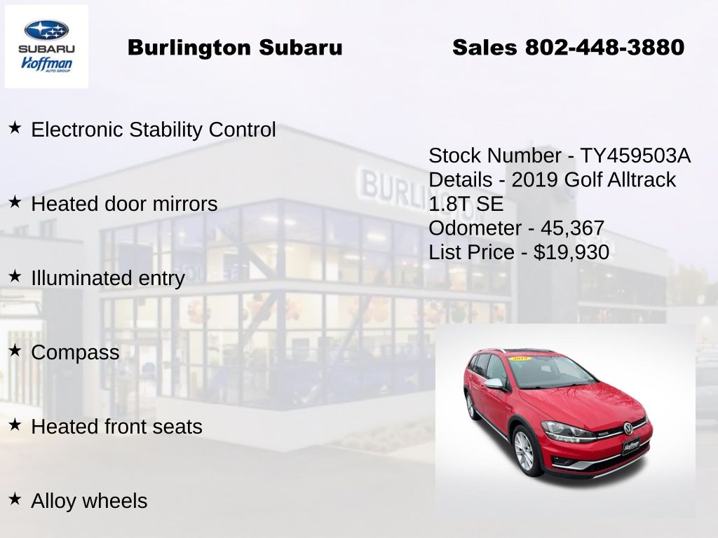 Volkswagen Golf Alltrack TSI SE 2019 ABS brakes, Alloy wheels, Compass, Electronic Stability Control, Heated door mirrors, Heated front seats, Illuminated entry, Low tire pressure warning, Power driver seat, Power steering, Power windows, Remote keyless entry, Steering wheel mounted audio controls, Traction control. Odometer is 29647 miles below market average!