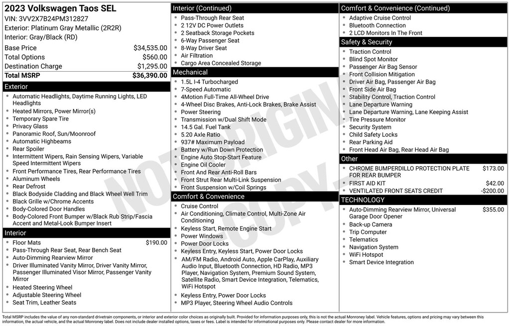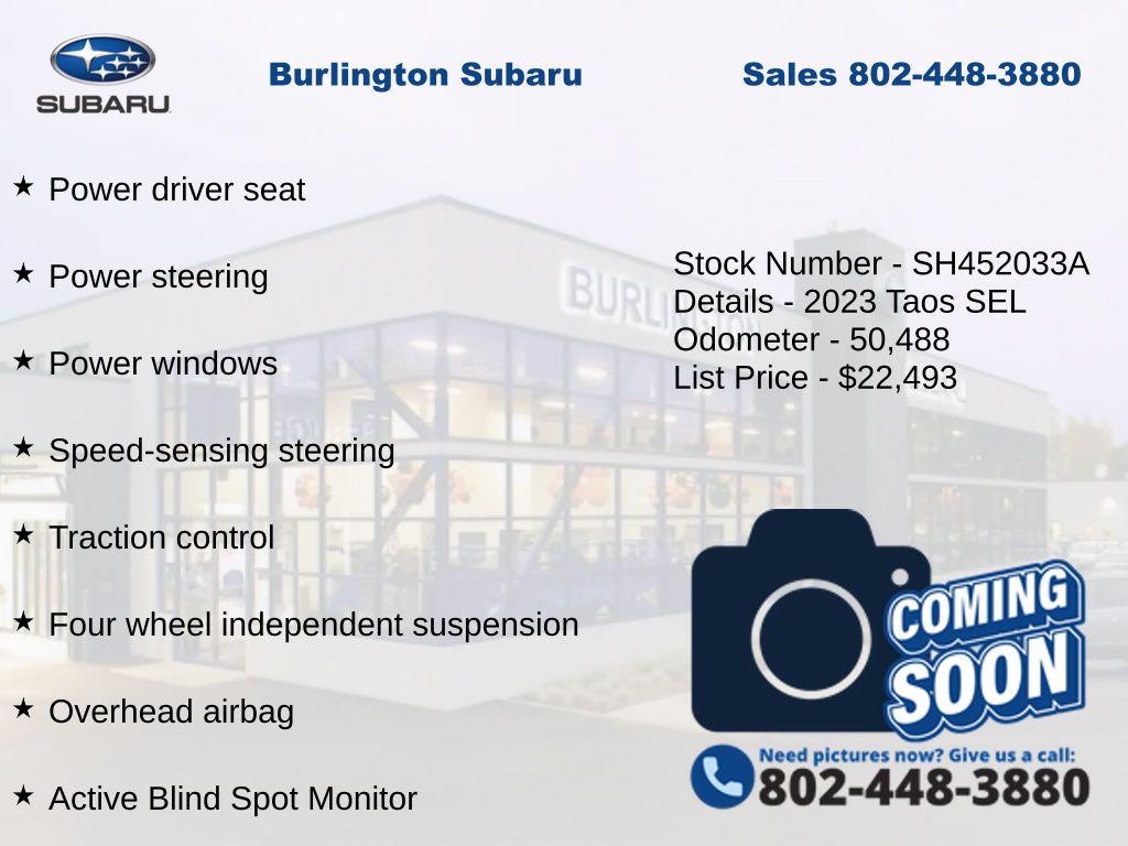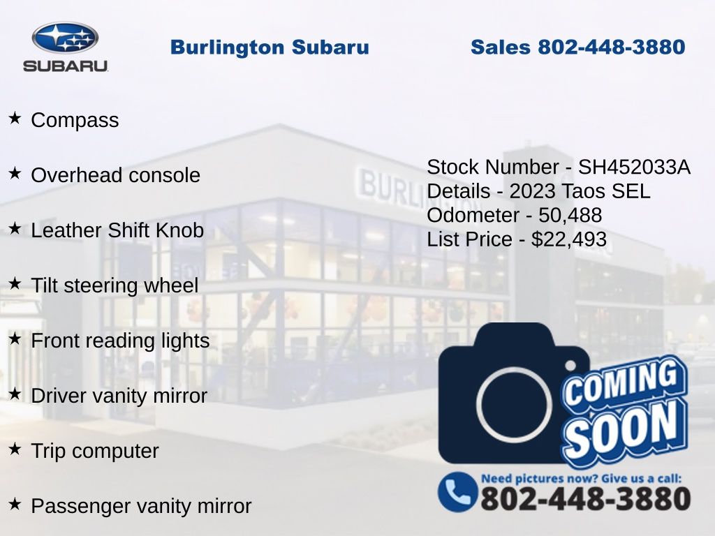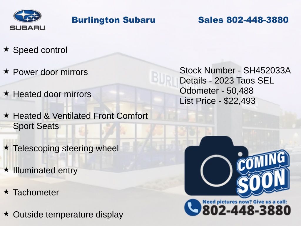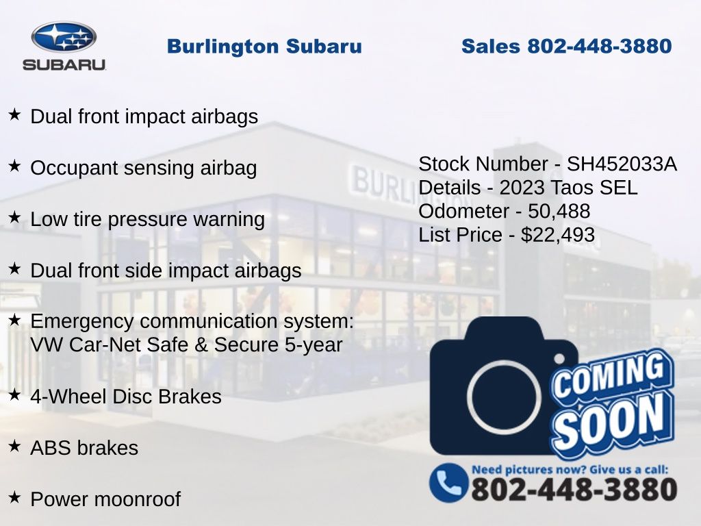 CARFAX One-Owner. Clean CARFAX. Volkswagen Taos 1.5T SEL 2023 4-Wheel Disc Brakes, ABS brakes, Active Blind Spot Monitor, Air Conditioning, Alloy wheels, Auto High-beam Headlights, Auto-dimming Rear-View mirror, Automatic temperature control, Brake assist, Compass, Delay-off headlights, Driver vanity mirror, Dual front impact airbags, Dual front side impact airbags, Electronic Stability Control, Emergency communication system: VW Car-Net Safe & Secure 5-year, Exterior Parking Camera Rear, Four wheel independent suspension, Front dual zone A/C, Front reading lights, Fully automatic headlights, Heated & Ventilated Front Comfort Sport Seats, Heated door mirrors, Heated front seats, Heated steering wheel, Illuminated entry, Leather Shift Knob, Low tire pressure warning, Navigation system: VW Car-Net Guide & Inform, Occupant sensing airbag, Outside temperature display, Overhead airbag, Overhead console, Panic alarm, Passenger vanity mirror, Perforated Vienna Leather Seating Surfaces, Power door mirrors, Power driver seat, Power moonroof, Power steering, Power windows, Radio: MIB3 Discover Media AM/FM/HD, Rain sensing wipers, Rear Parking Sensors, Rear window defroster, Rear window wiper, Remote keyless entry, Speed control, Speed-sensing steering, Split folding rear seat, Steering wheel mounted audio controls, Tachometer, Telescoping steering wheel, Tilt steering wheel, Traction control, Trip computer, Variably intermittent wipers, Ventilated front seats.